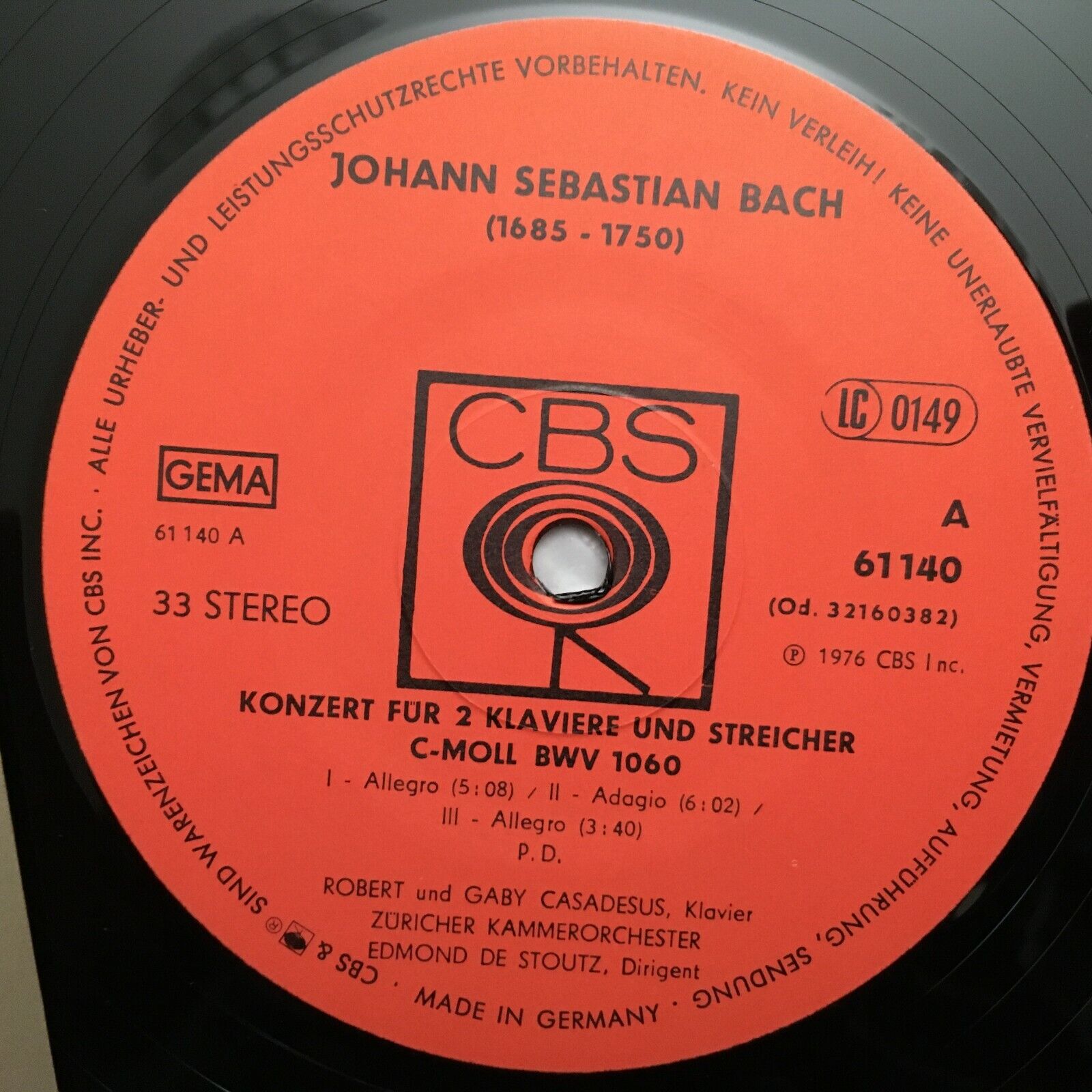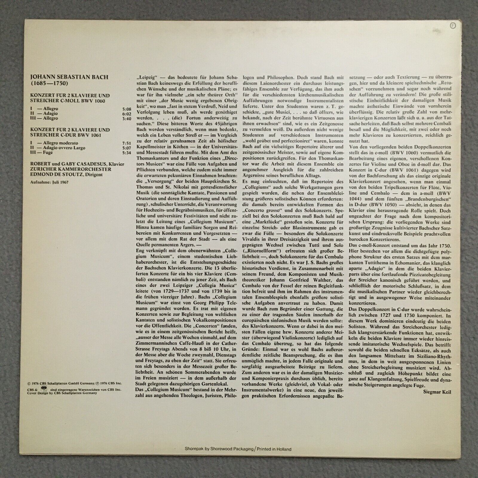 S109 Bach Concertos for 2 Pianos R. & G. Casadesus De Stoutz CBS 61 140 Stereo