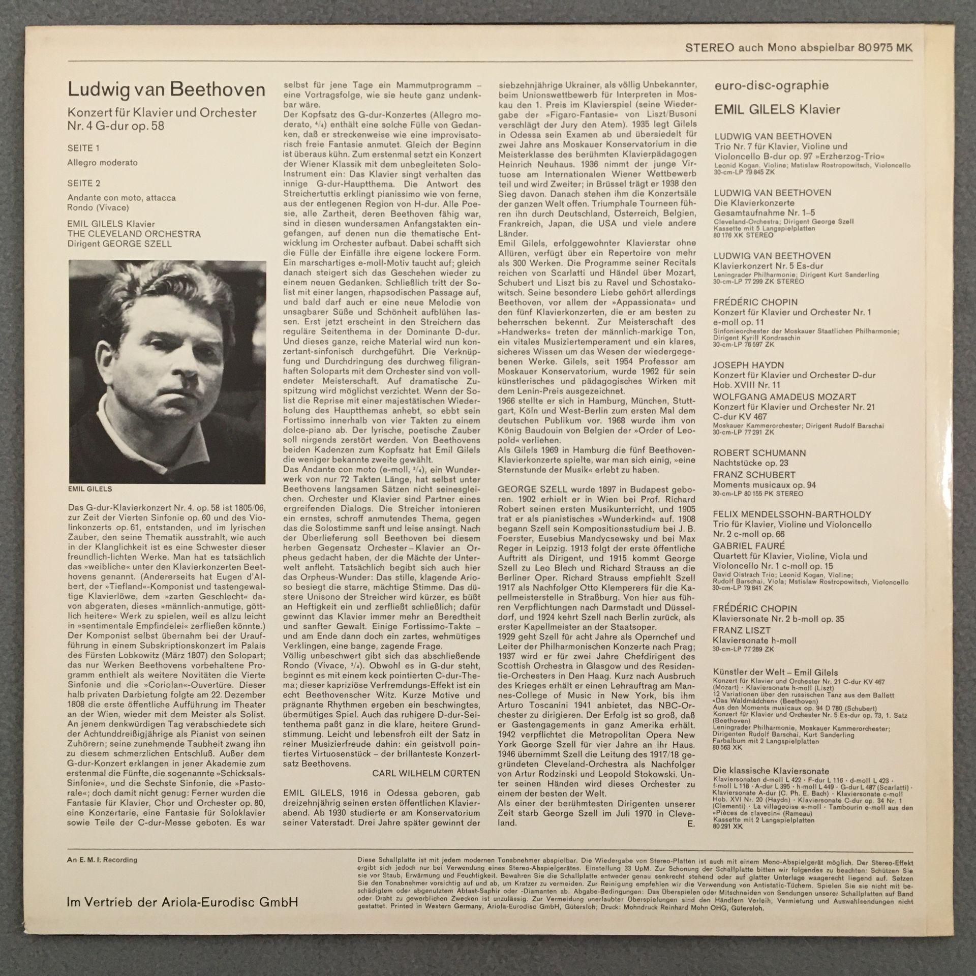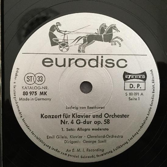 O734 Beethoven Piano Concerto No.4 Gilels Szell Eurodisc 80 975 MK Stereo