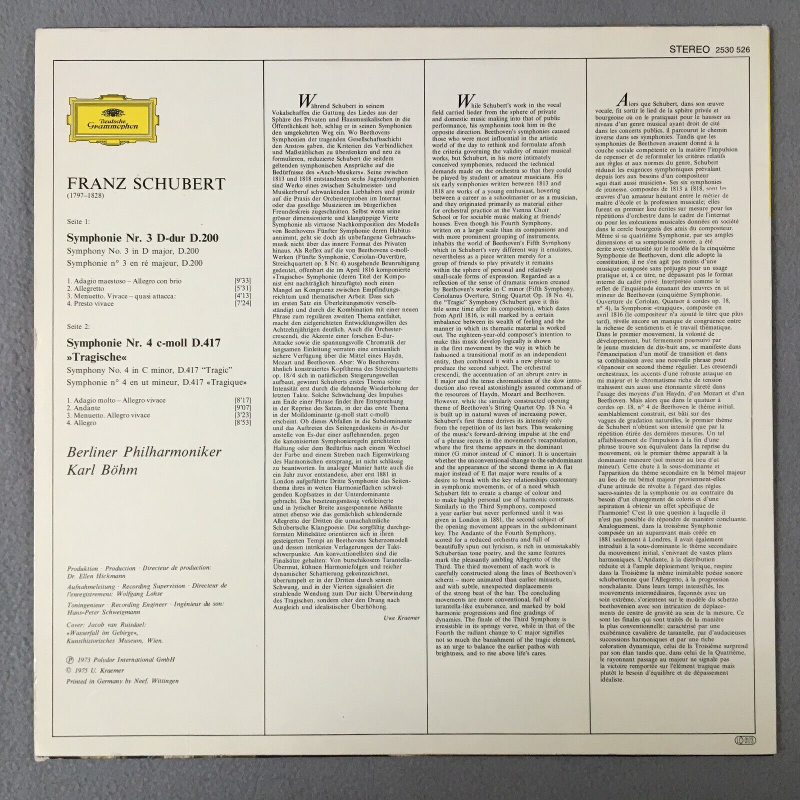 R965 Schubert Symphonies No.3 & No.4 Bohm BPO DGG 2530 526 Stereo