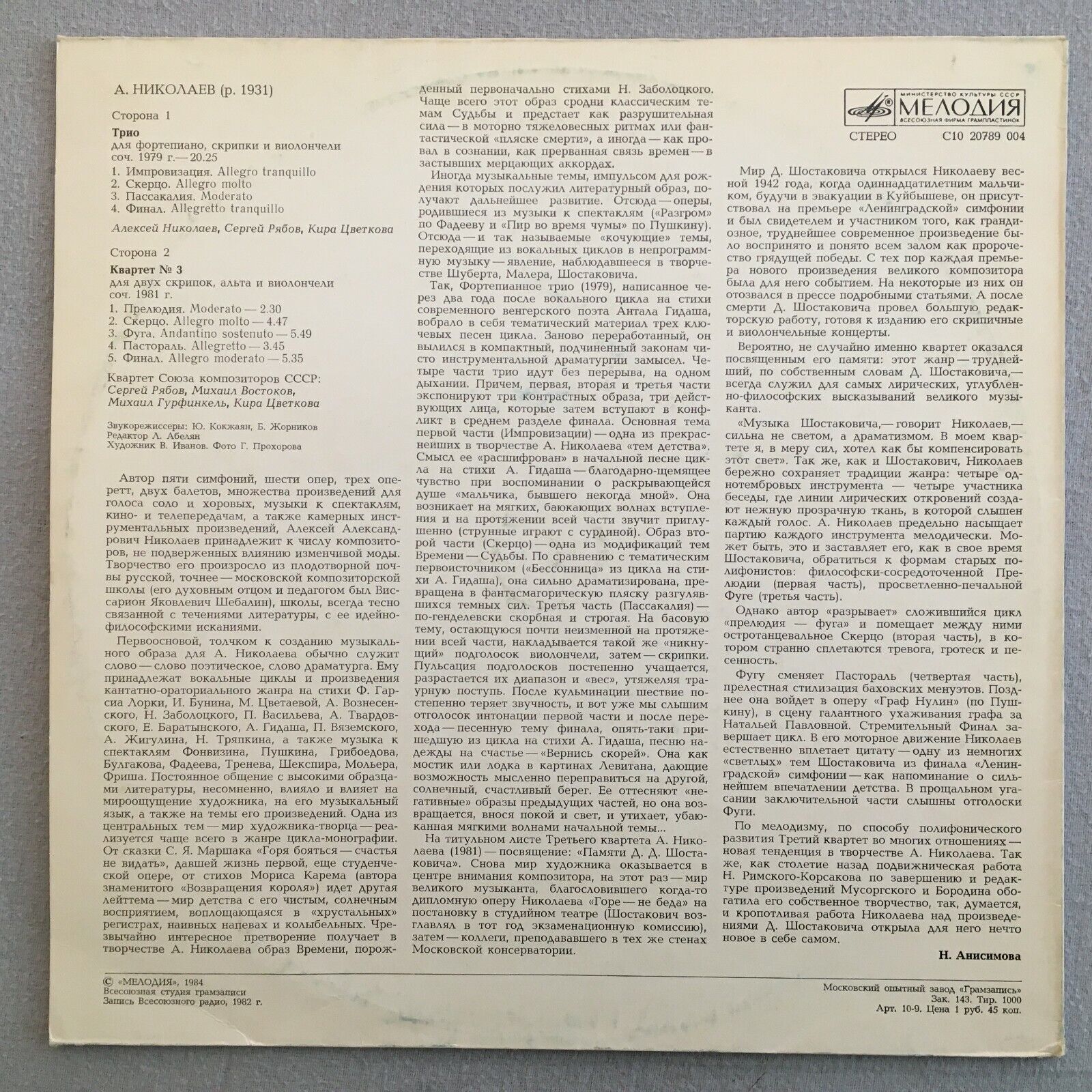 V562 Nikolaev Piano Trio String Quartet No.3 Melodiya C10 30789 004 Stereo