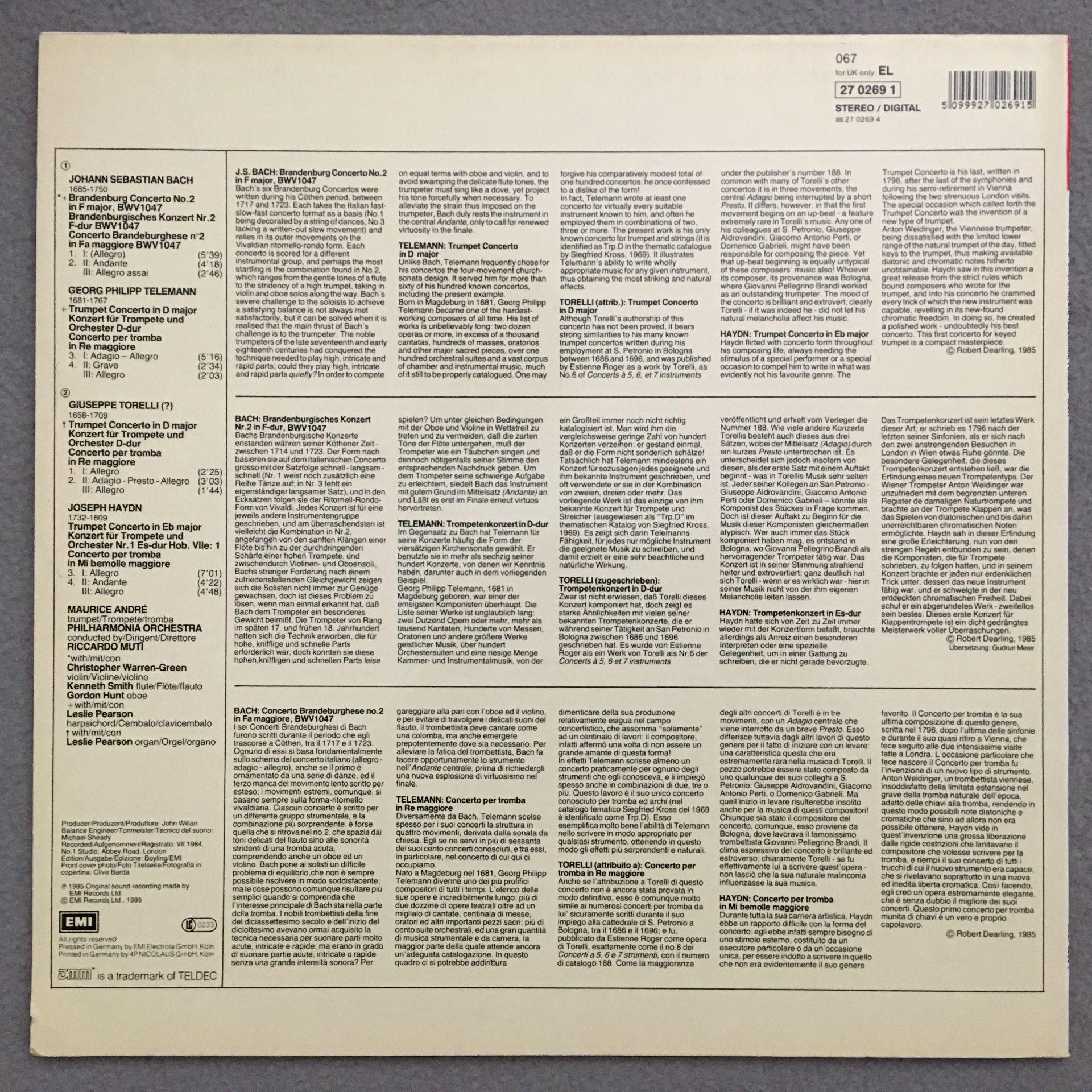 O928 Bach Haydn Telemann Concertos Andre Muti EMI 27 0269 1 Digital Stereo