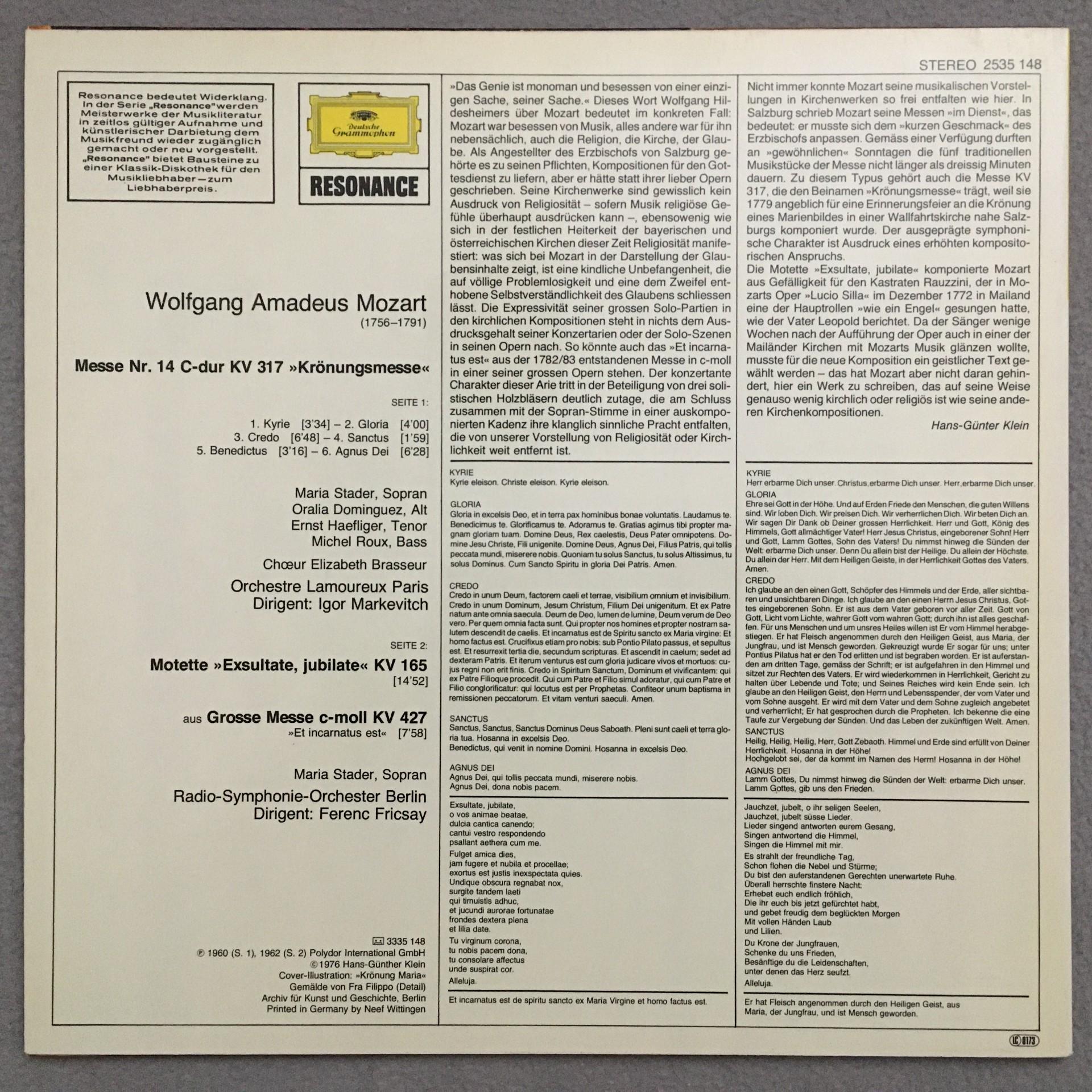 O935 Mozart Coronation Mass Haefliger Stader Markevich DGG 2535 148 Stereo
