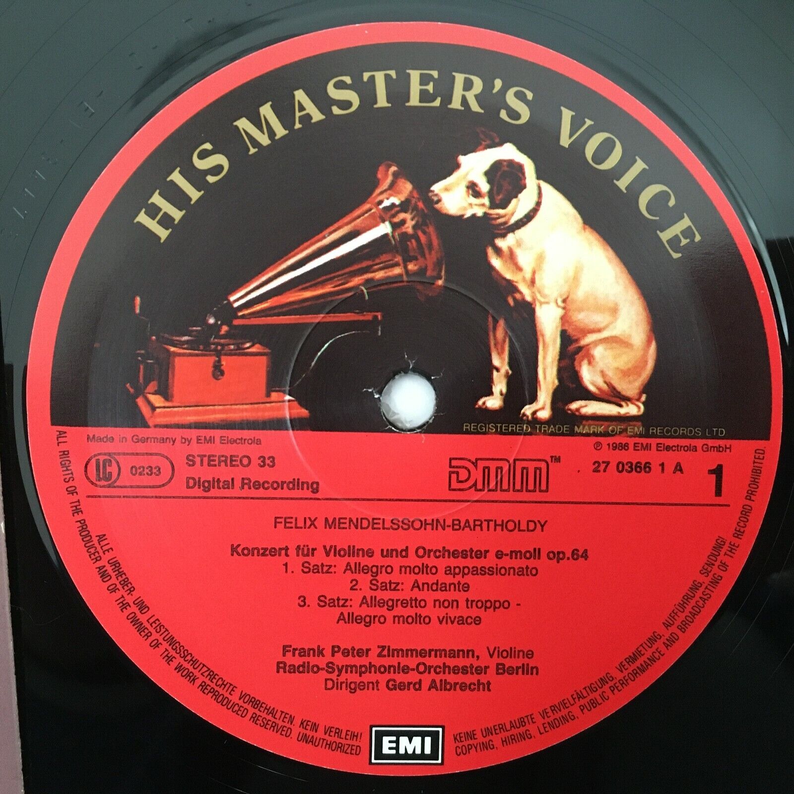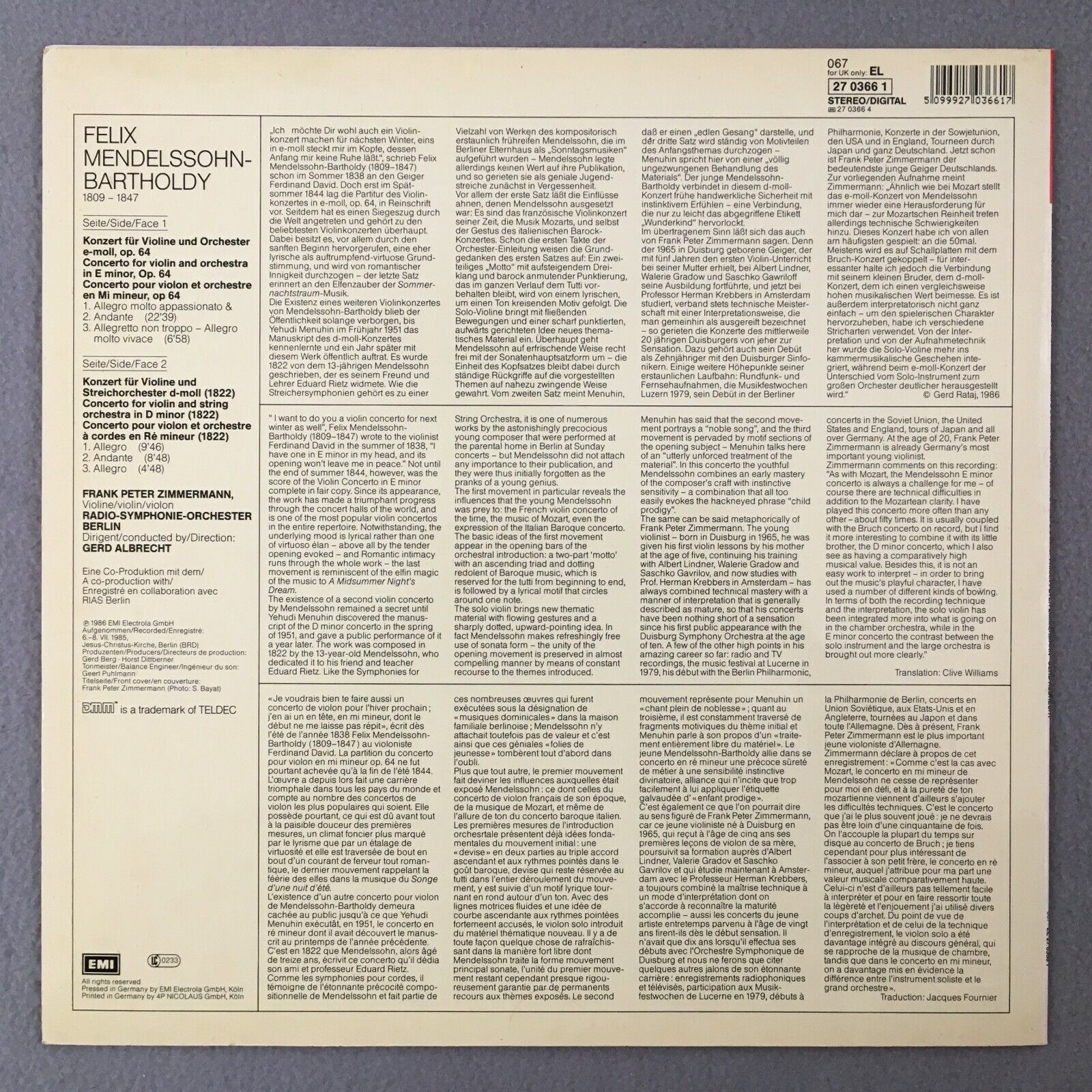 R186 Mendelssohn Violin Concertos Zimmermann Albrecht EMI 27 0366 1 Digital St