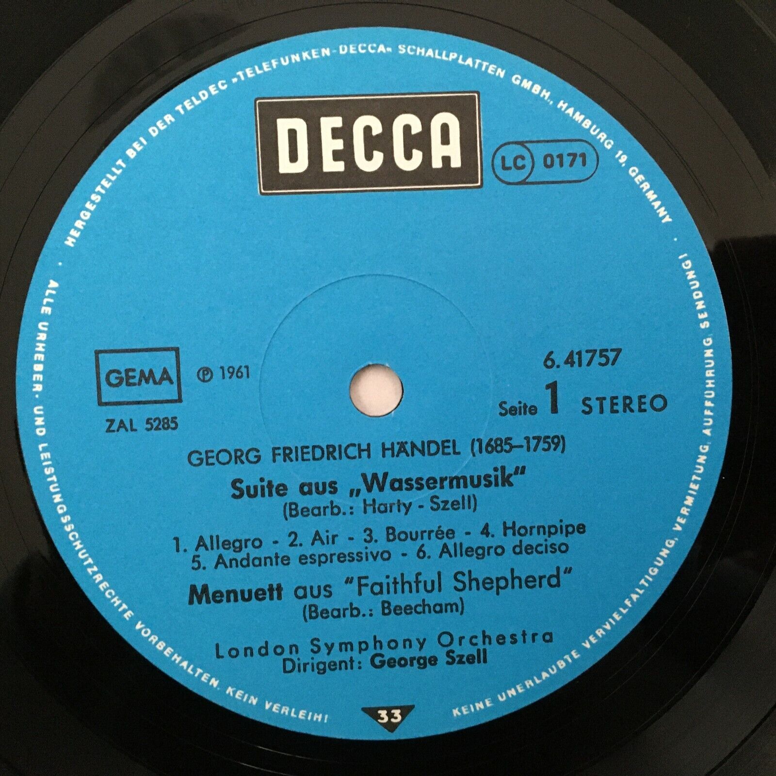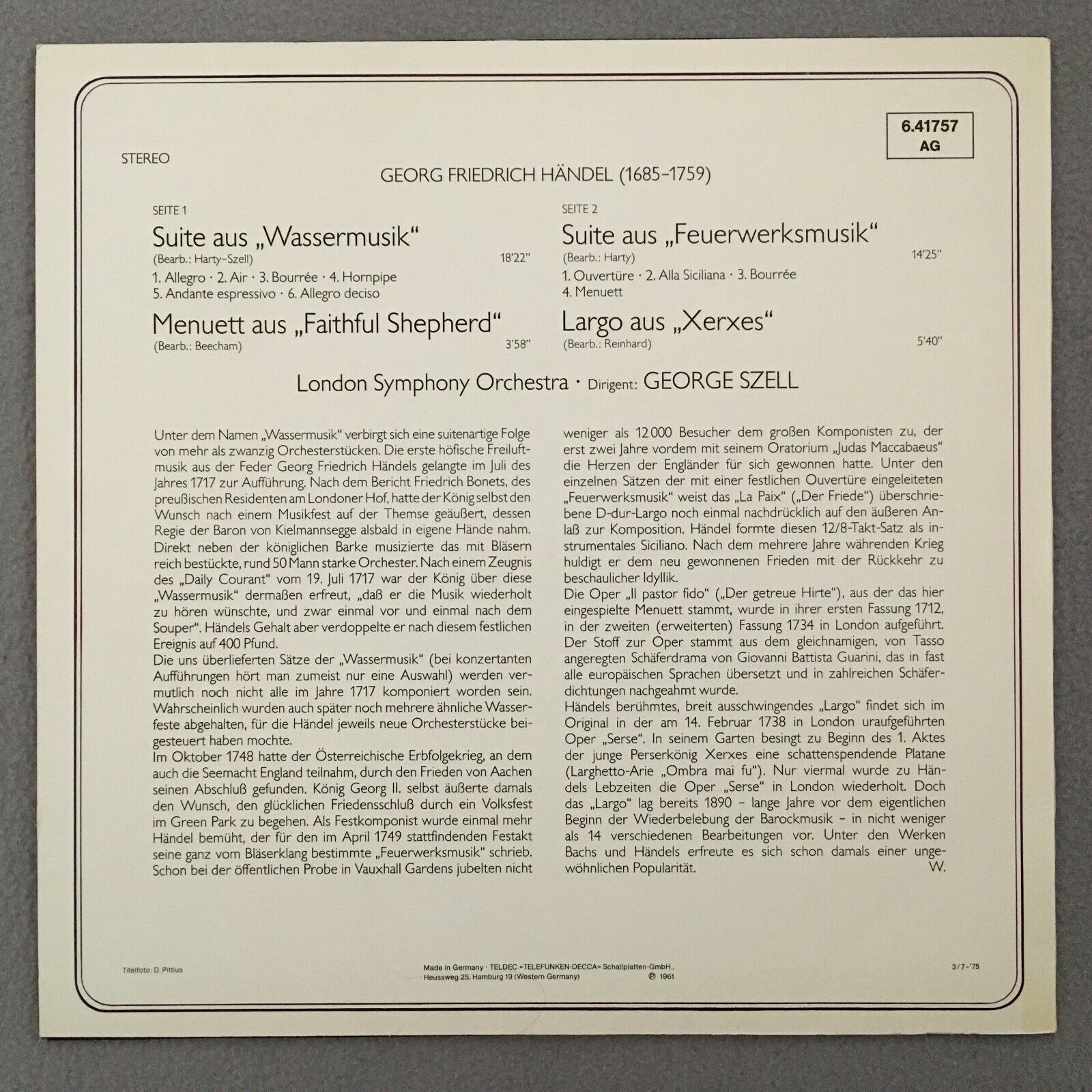 R181 Handel Fireworksmusic Watermusic Szell DECCA 6.41757 AG Stereo
