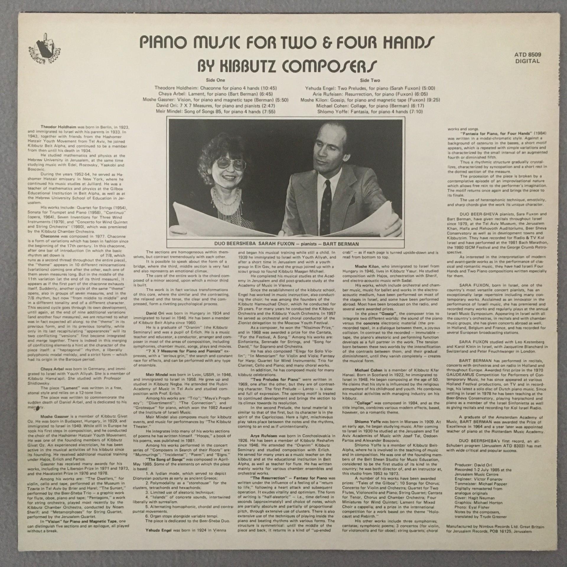 P553 Piano Music for 2 & 4 Hands Duo Beersheba Jerusalem Records ATD 8509 Dig St