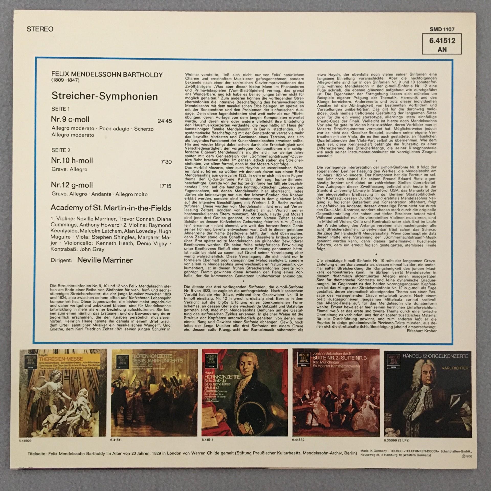 P557 Mendelssohn String Symphonies No.9,10,12 Marriner DECCA 6.41512 AN Stereo