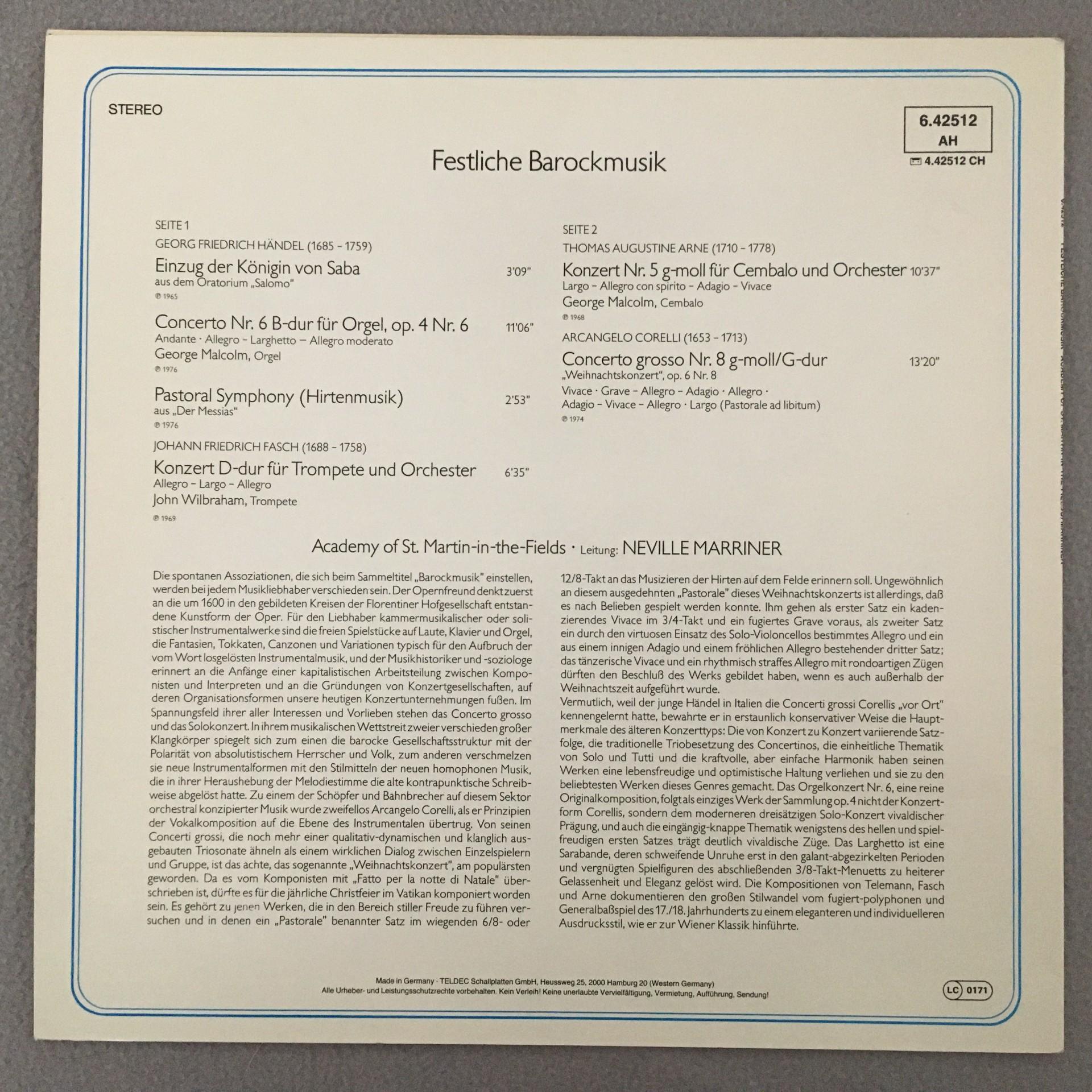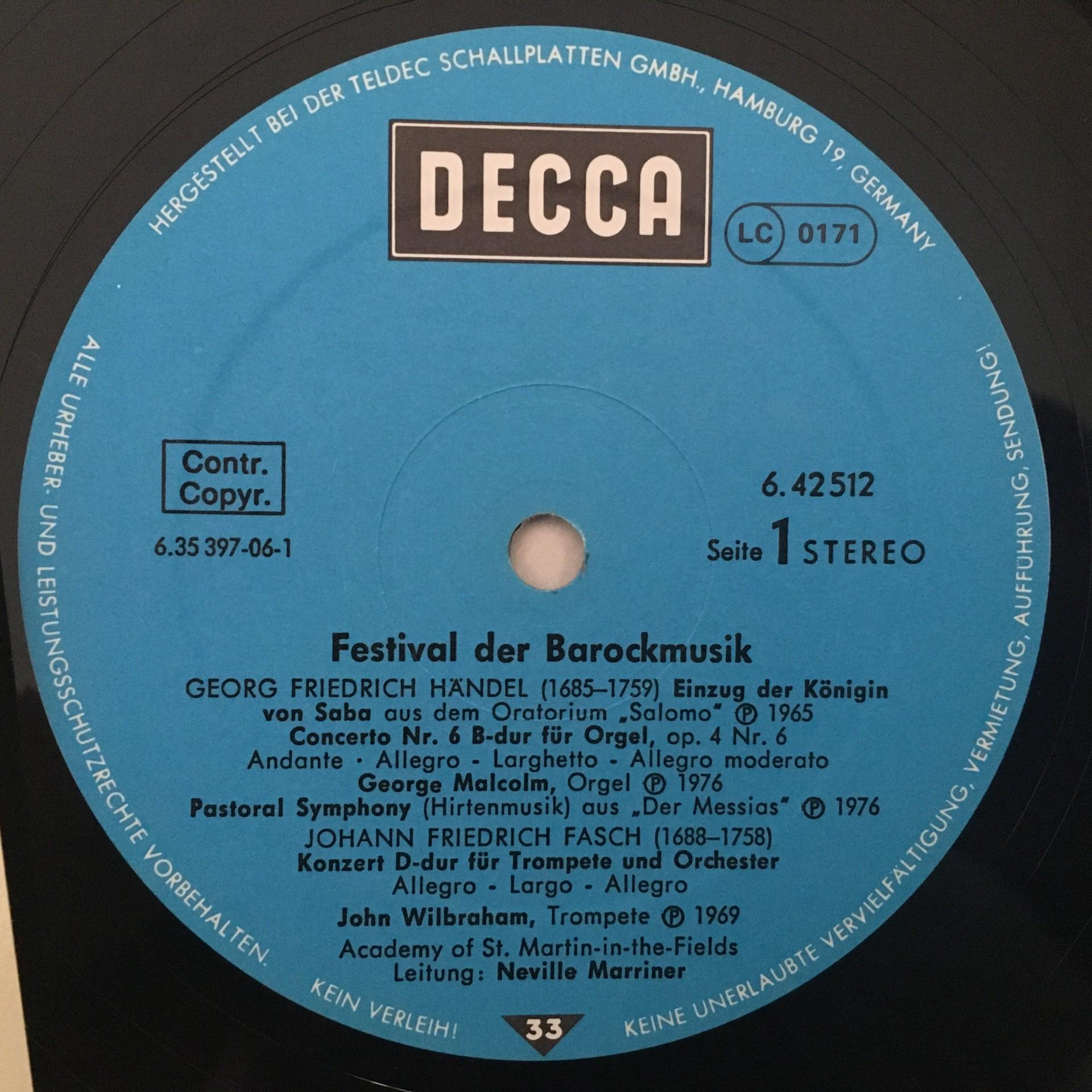 P564 Festive Baroque Music Handel Corelli Marriner DECCA 6.42512 AH Stereo