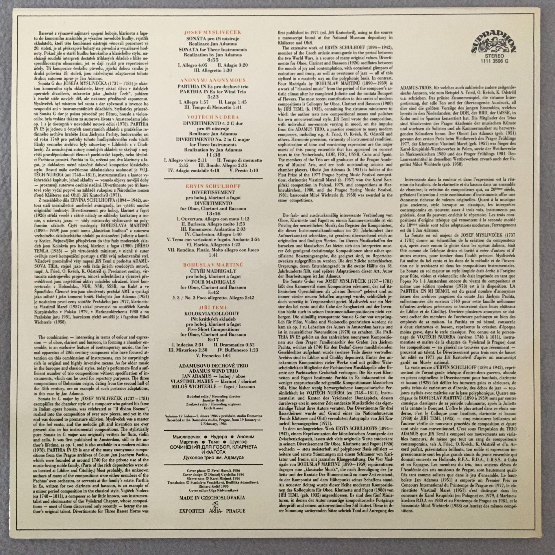 P568 Works for Oboe Clarinet Bassoon Adamus Wind Trio Supraphon 1111 3596 G Ster