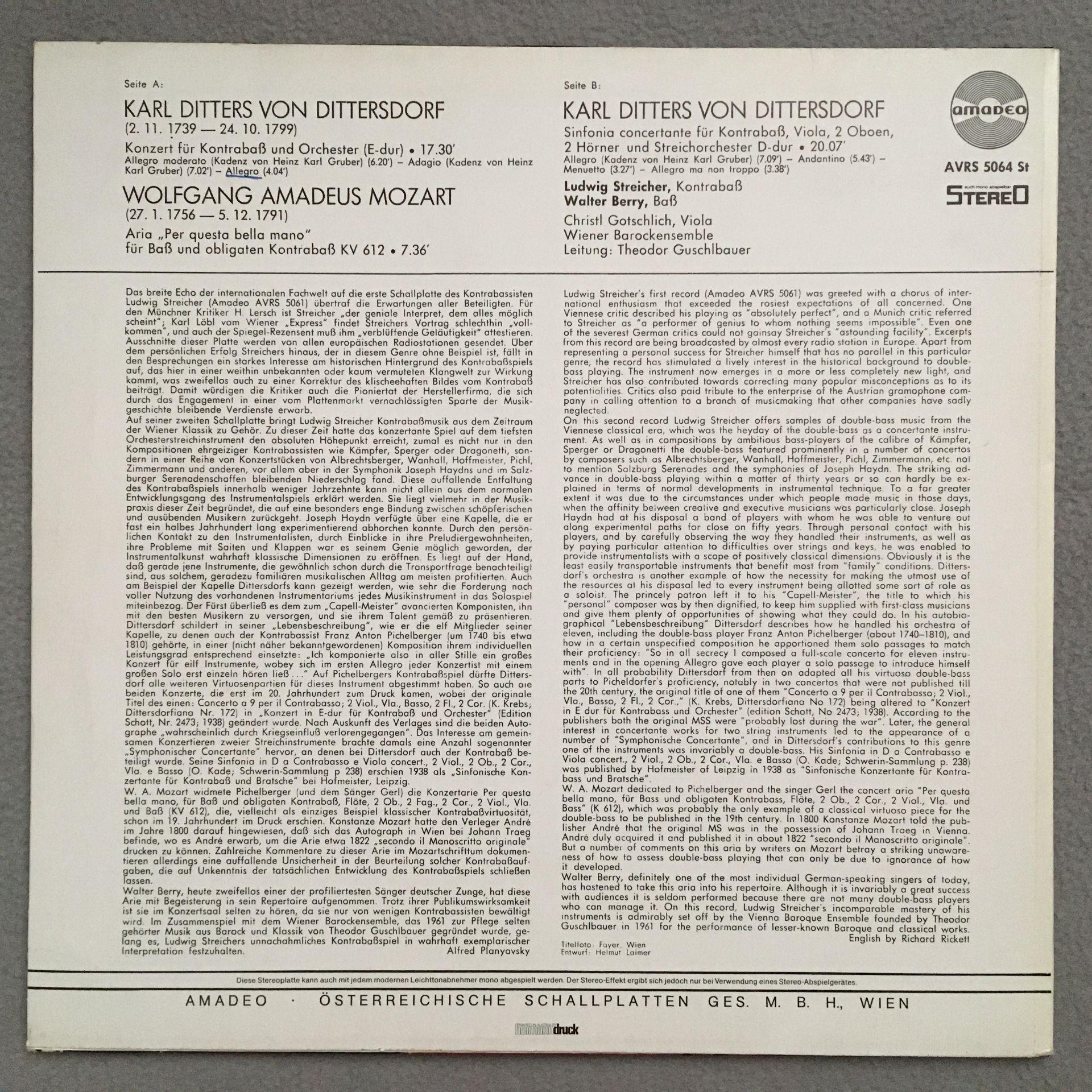 P589 Mozart Aria Dittersdorf Concerto Streicher Berry Amadeo AVRS 5064 Stereo