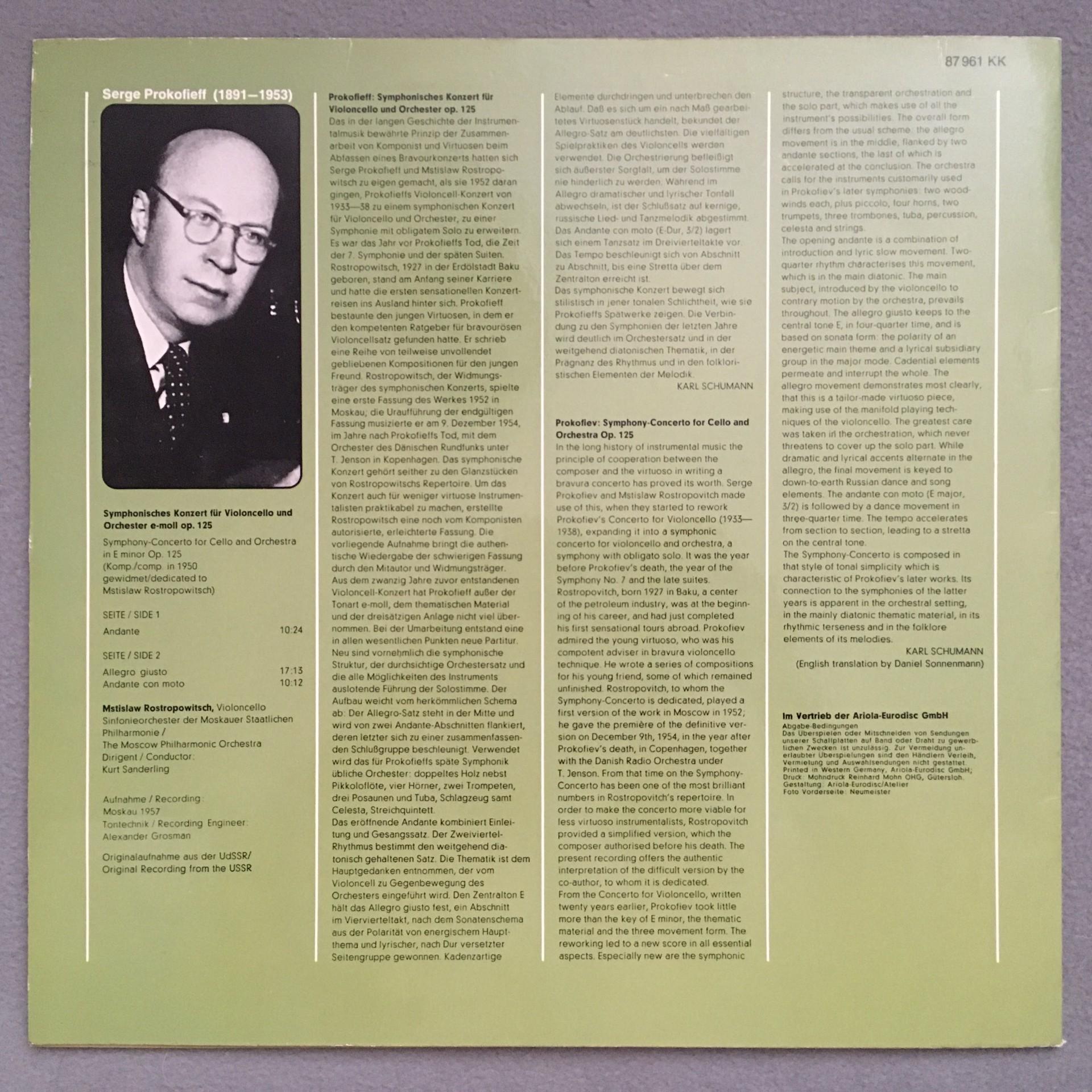 R641 Prokofiev Symphonic Concerto Rostropovich Sanderling Eurodisc 87 961 KK St