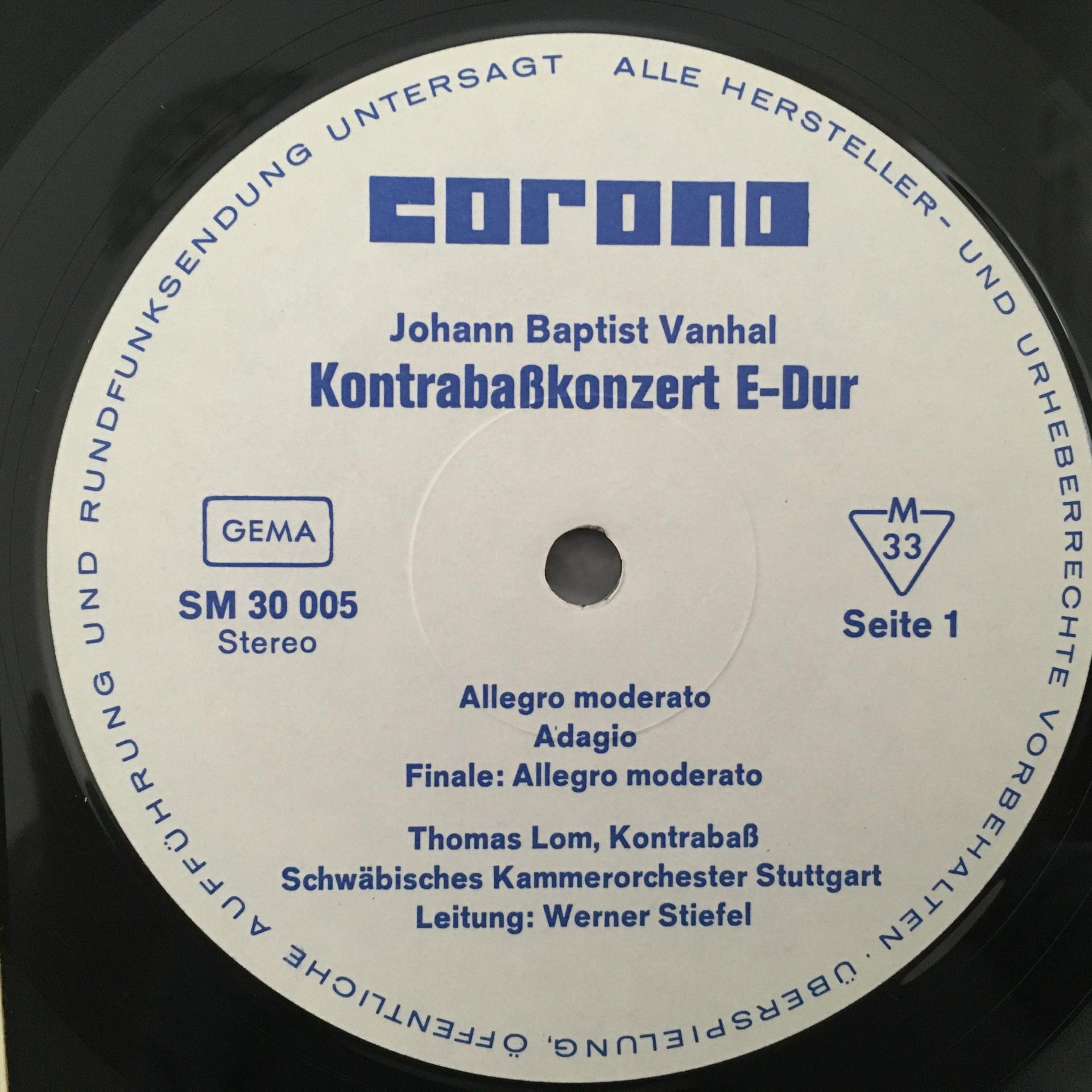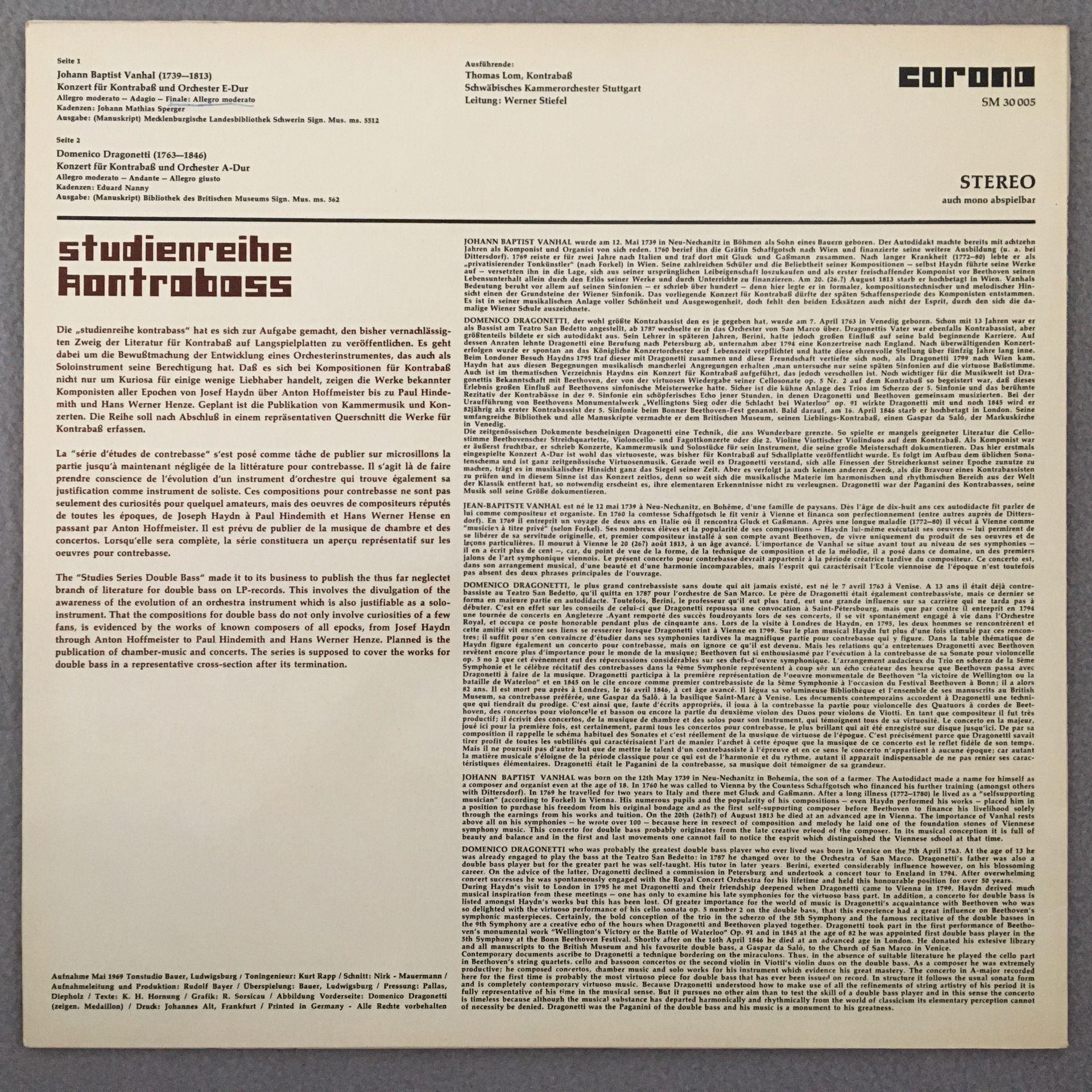 P614 Dragonetti Vanhal Contrabass Concertos Lom Stiefel Corona SM 30 005 Stereo