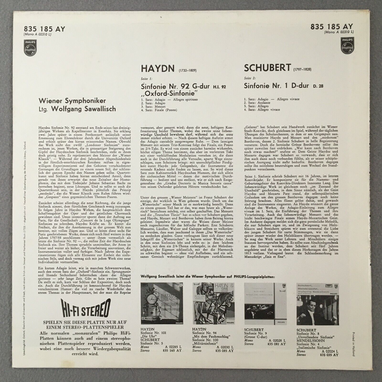 R137 Haydn Schubert Symphonies Sawallisch VSO Philips 835 185 AY Stereo