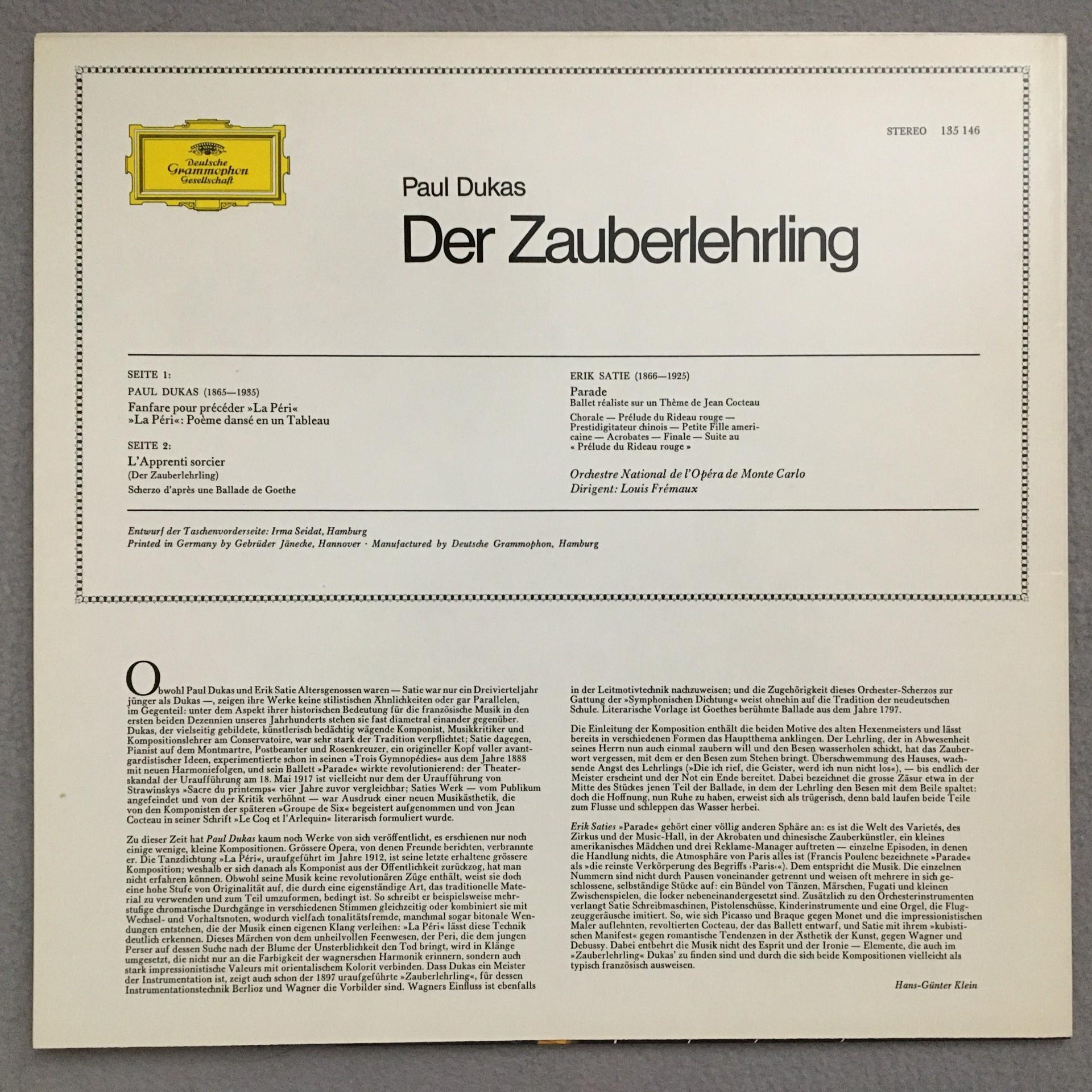P679 Dukas Zauberlehrling Satie Parade Fremaux DGG 135 146 Stereo