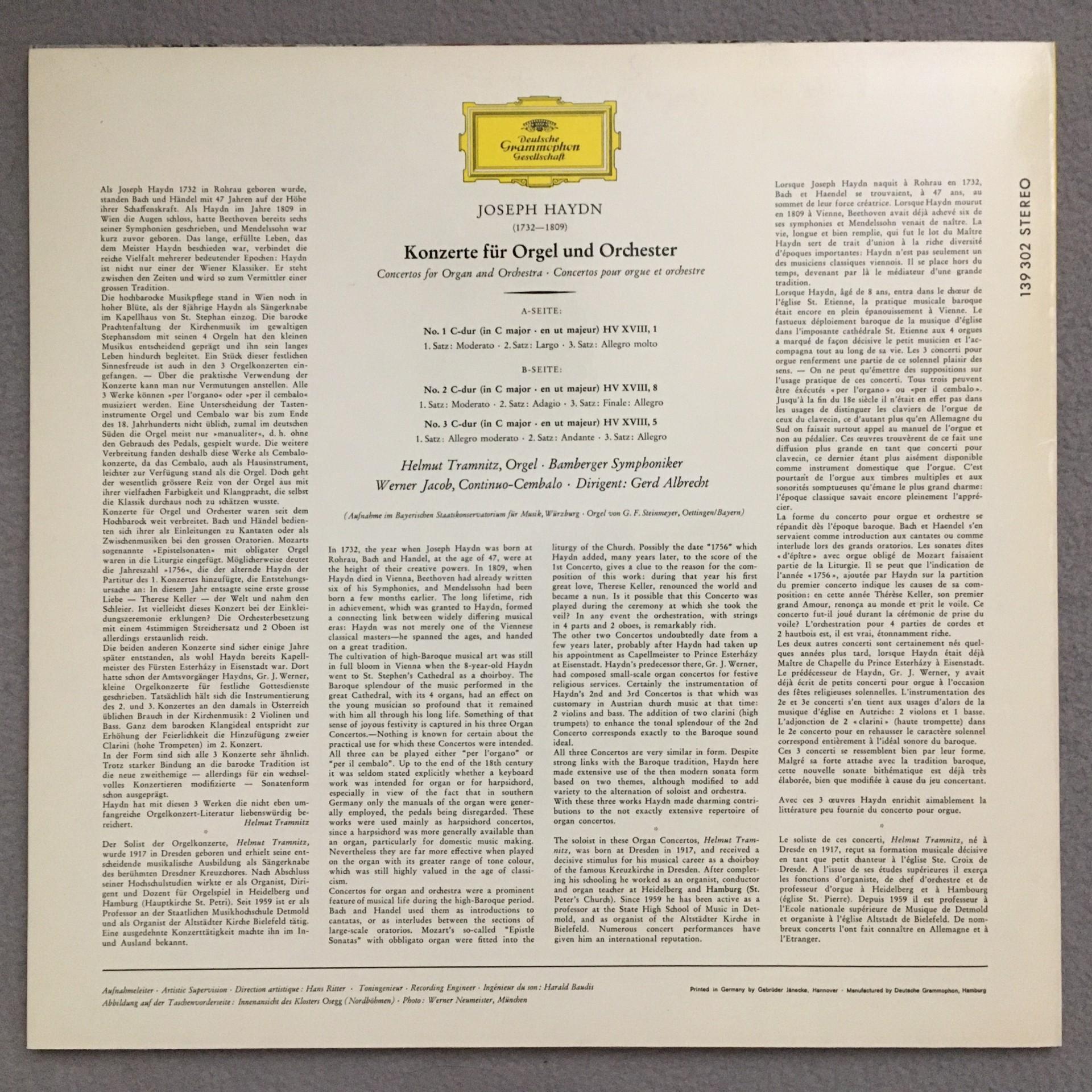 P691 Haydn 3 Organ Concertos Tramnitz Albrecht DGG 139 302 SLPM Stereo Tulip