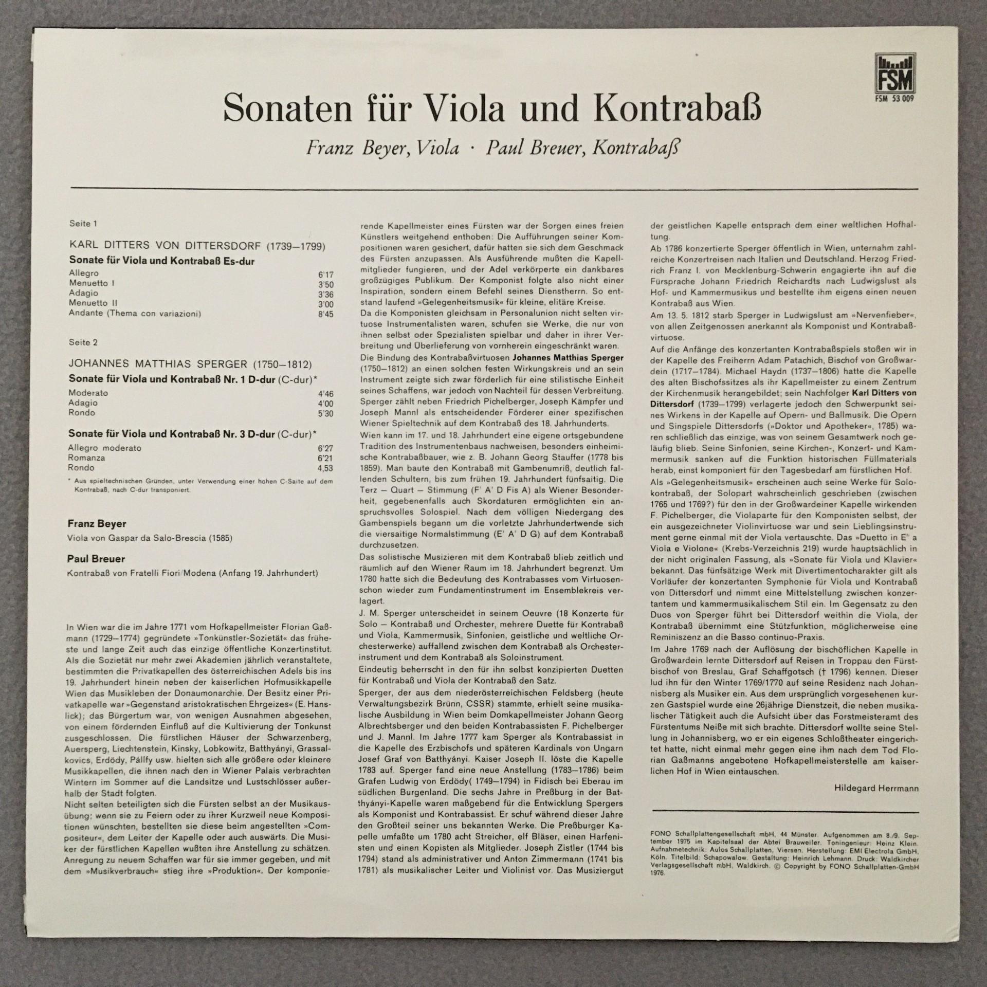 P721 Sonatas for Viola & Double Bass Beyer Breuer FSM 53 009 Stereo