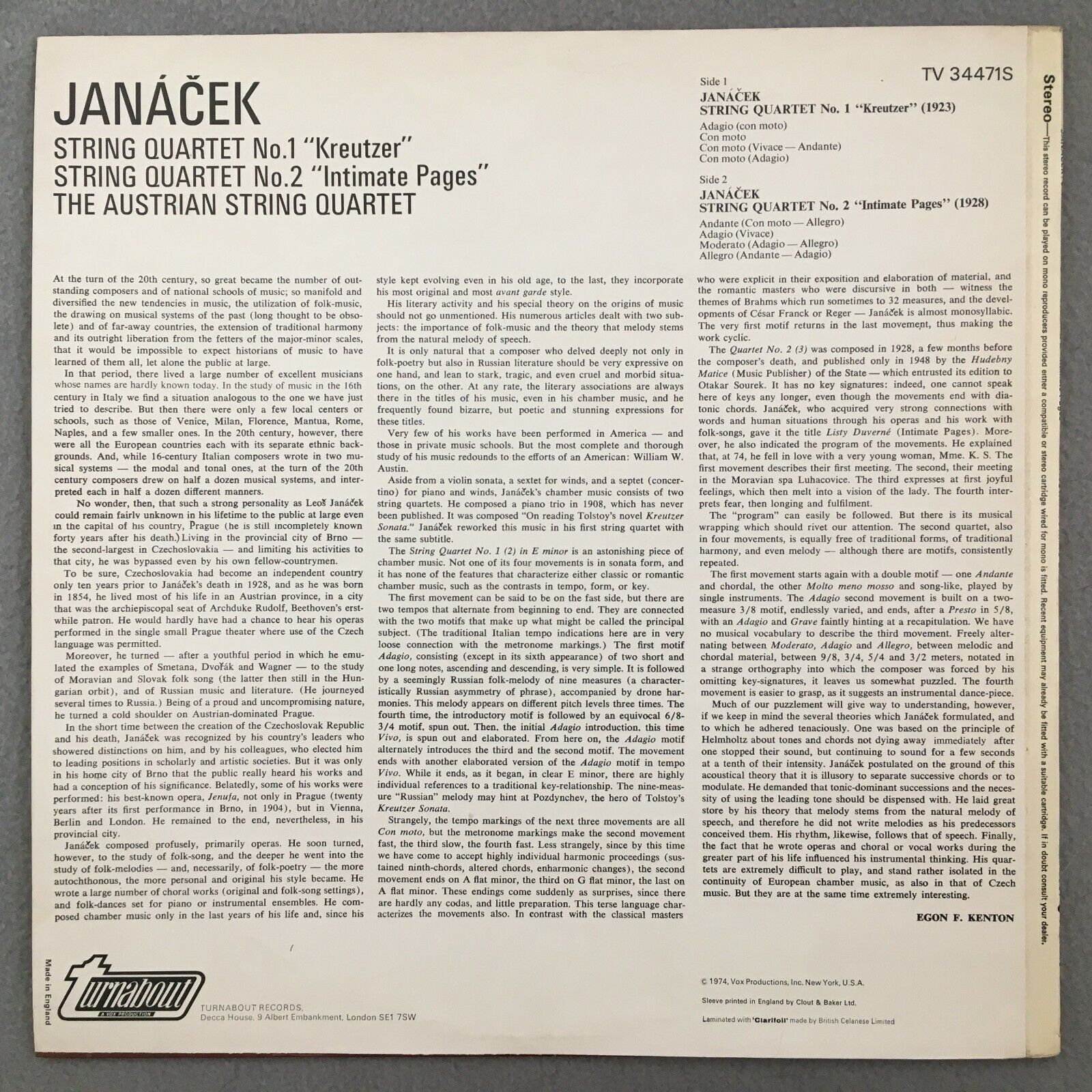 R110 Janacek String Quartets Austrian String Quartet Turnabout TV 34471S Stereo