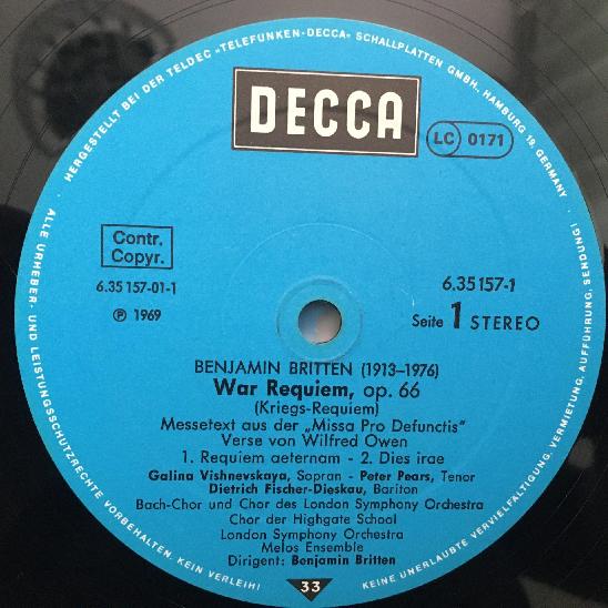 G775 Britten War Requiem Fischer-Dieskau Pears 2LP DECCA 6.35157 EK Stereo