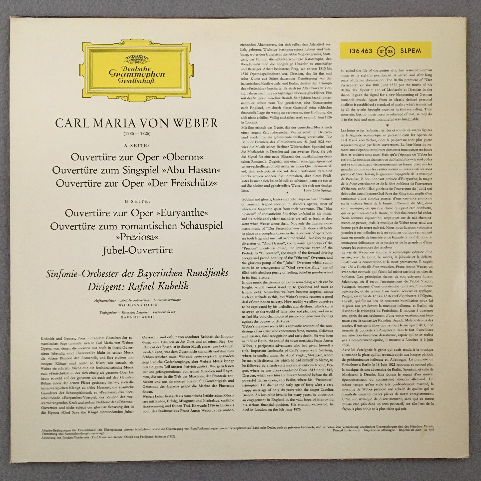 P821 Carl Maria von Weber Overtures Karajan DGG 136 463 SLPEM Red Stereo