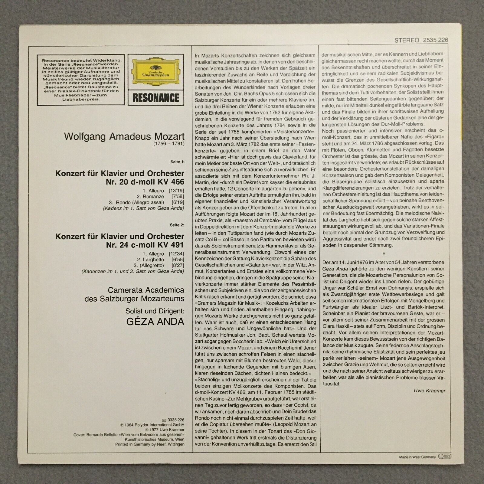 J260 Mozart Piano Concertos No.20 & No.24 Anda DGG 2535 226 Stereo