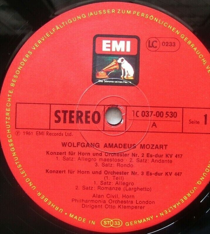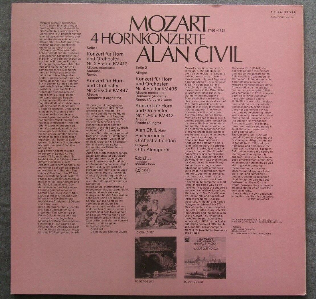 J252 Mozart 4 Horn Concertos No 1-4 Civil Klemperer EMI 1C 037-00530 Stereo
