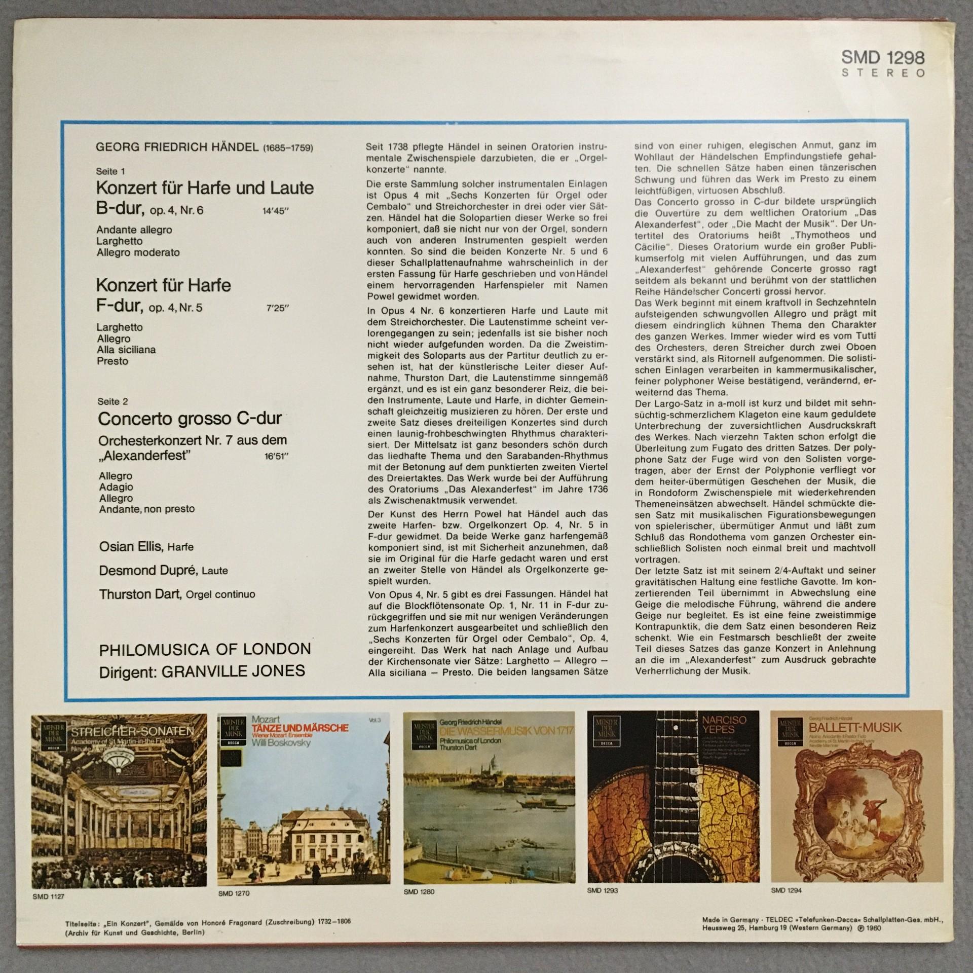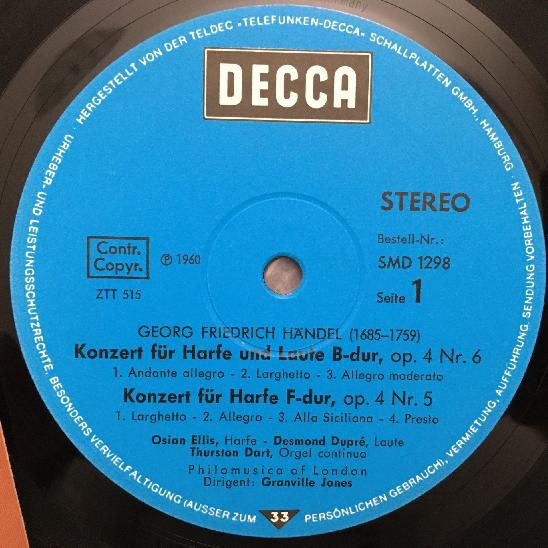 P882 Handel Harp Concertos Ellis Dupre Dart Jones DECCA SMD 1298 Stereo