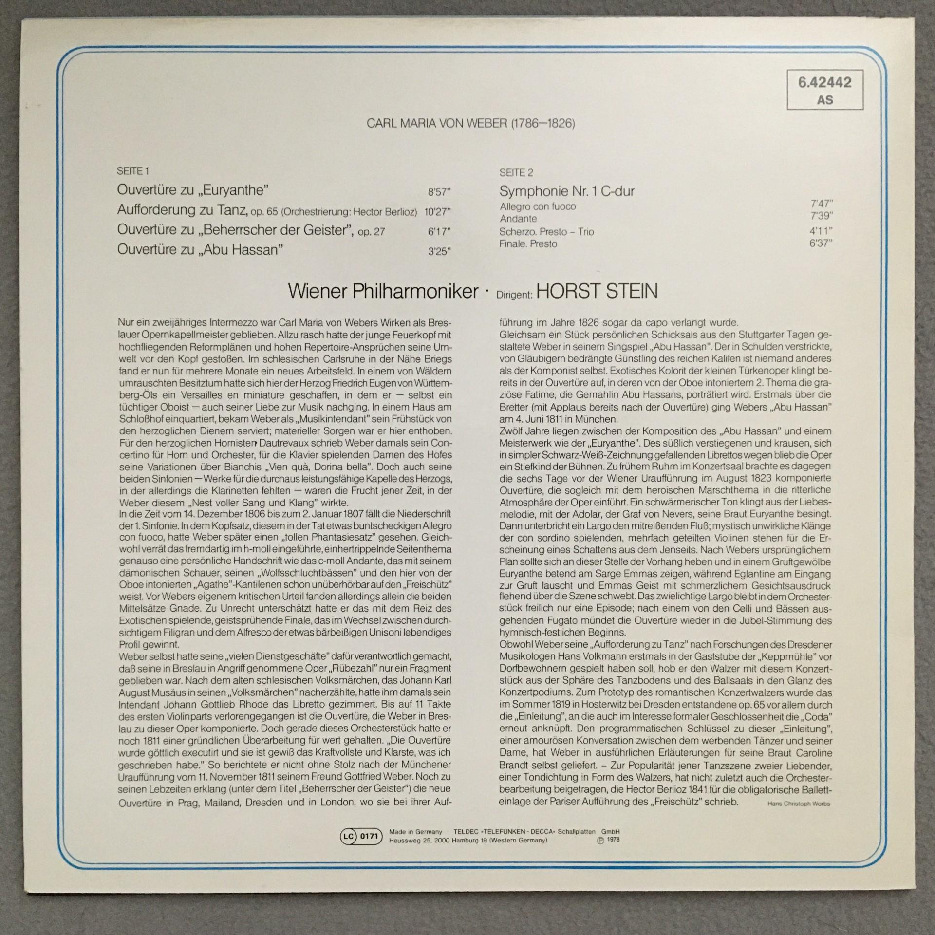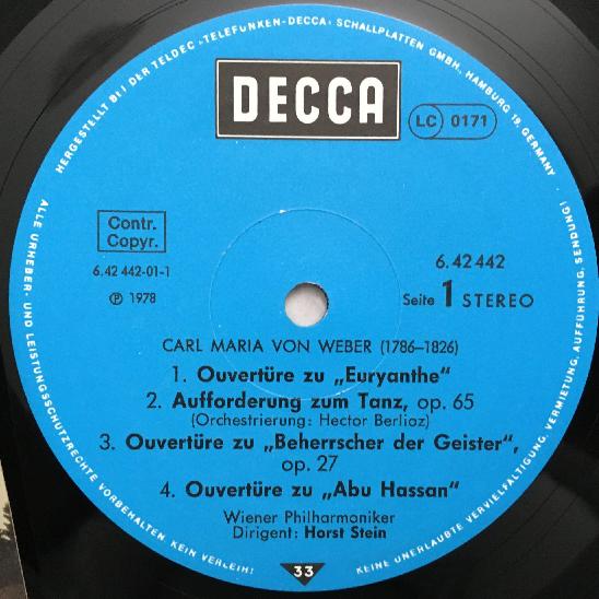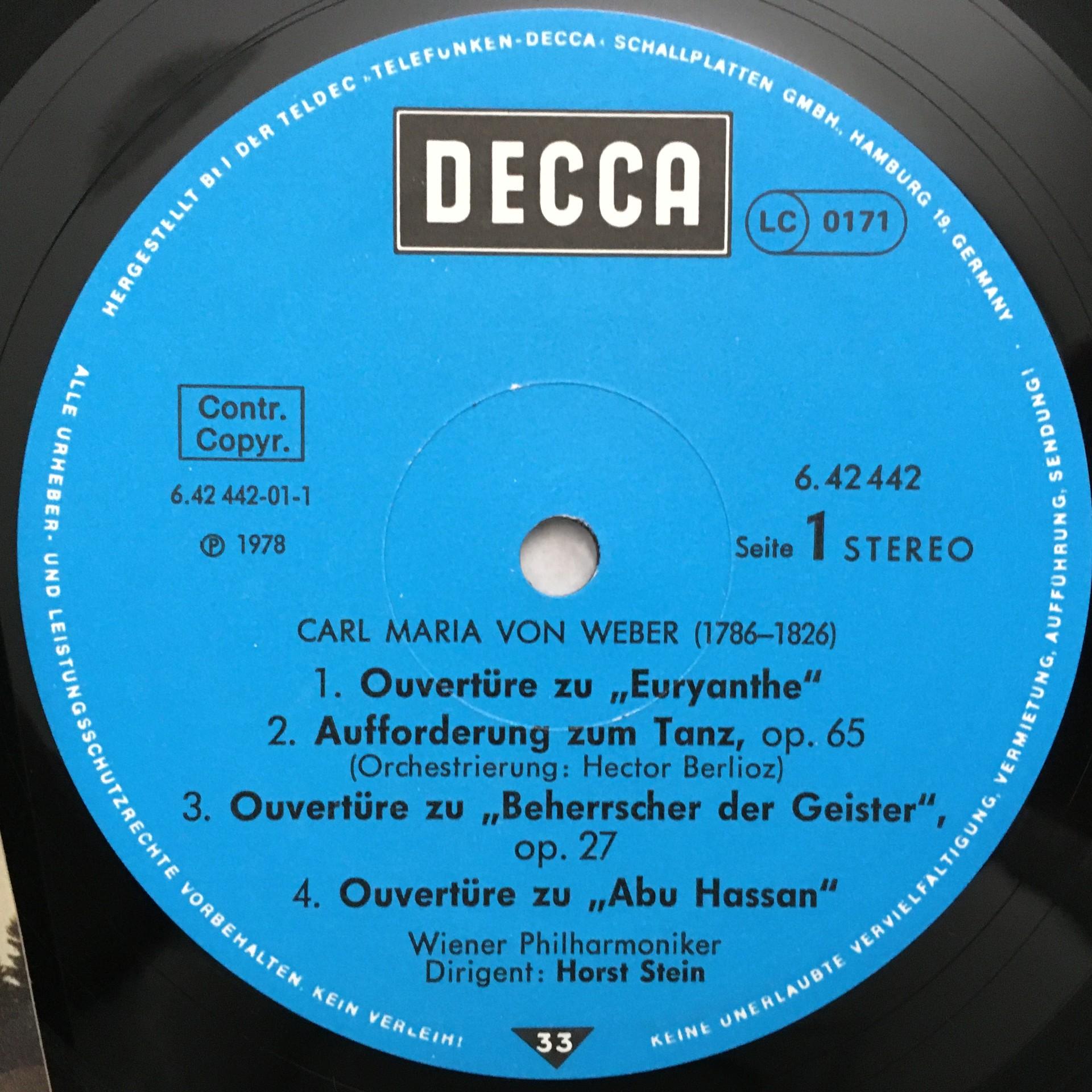 P883 von Weber Symphony No.1 Overtures Stein VPO DECCA 6.42442 AS Stereo