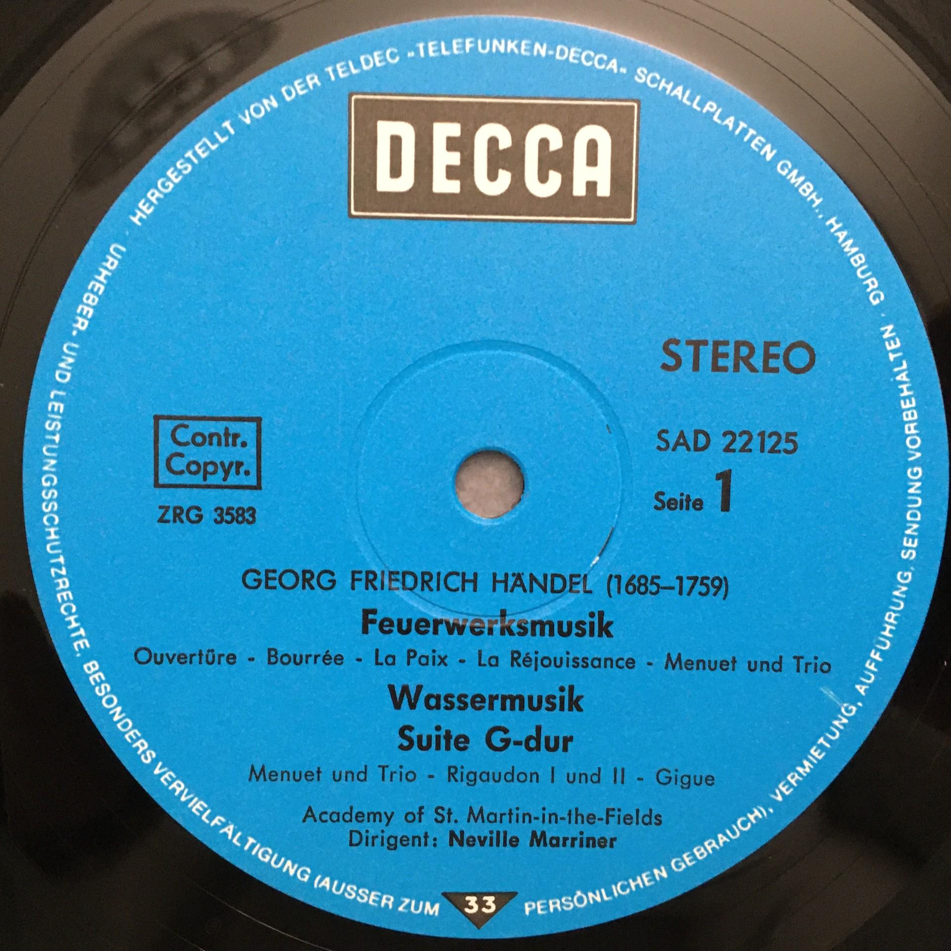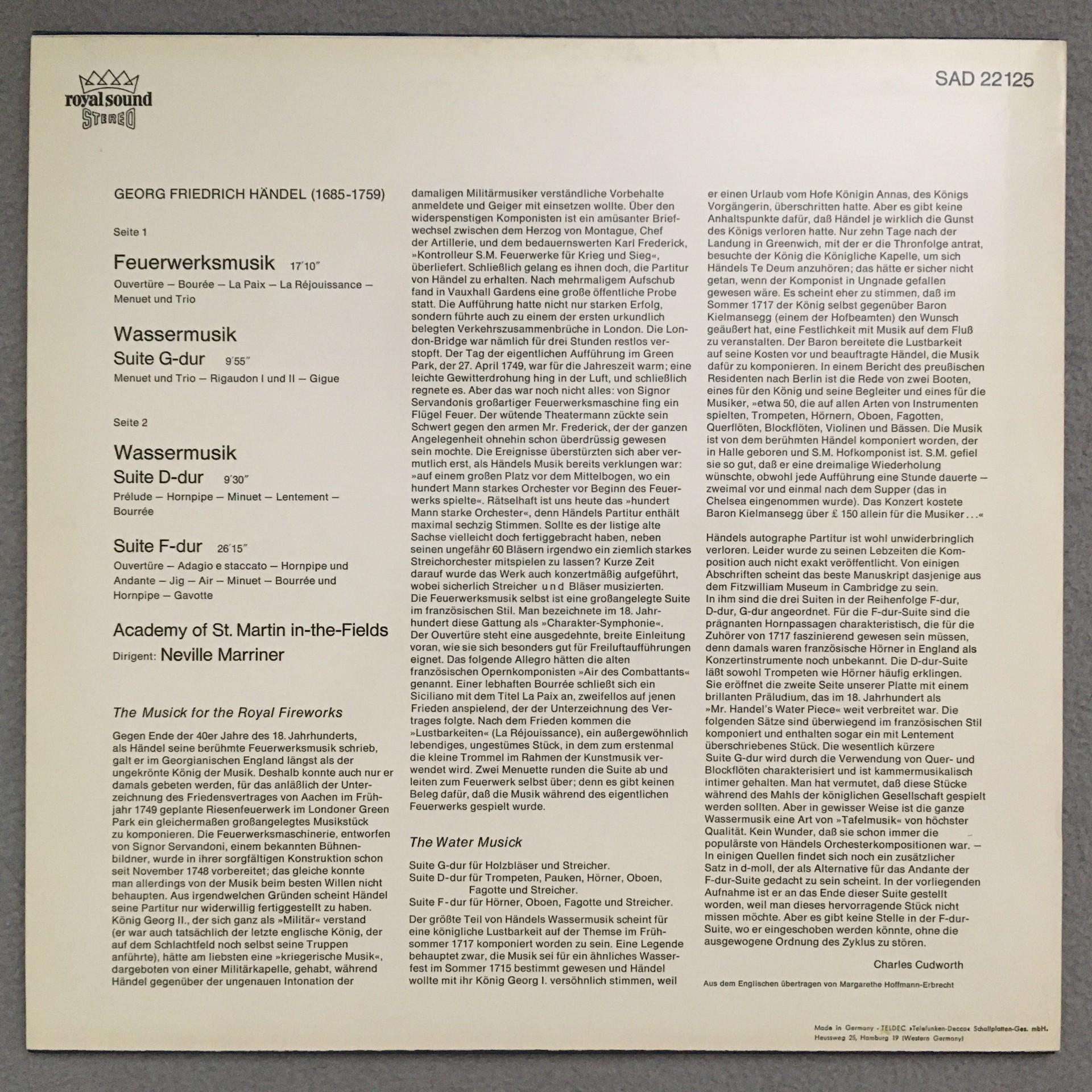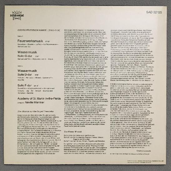 P893 Handel Fireworksmusic Watermusic Marriner DECCA SAD 22 125 Stereo