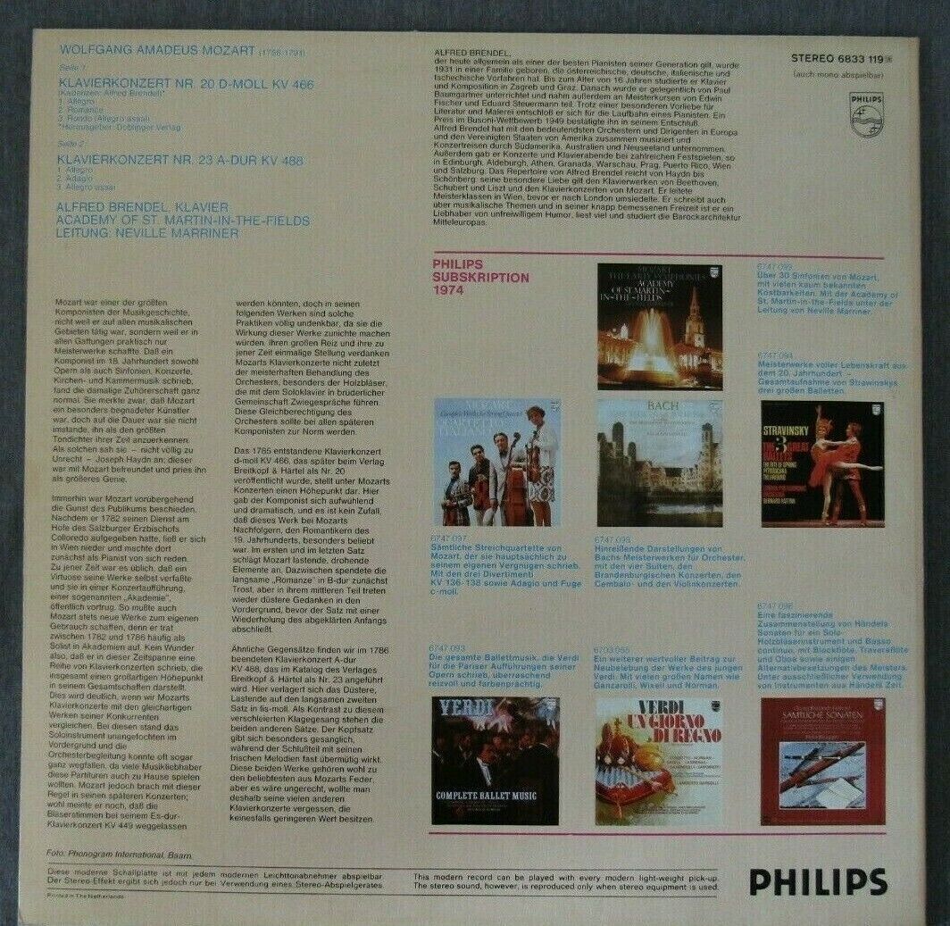 J218 Mozart Piano Concertos No.20 & 23 Brendel Marriner Philips 6833 119 Stereo