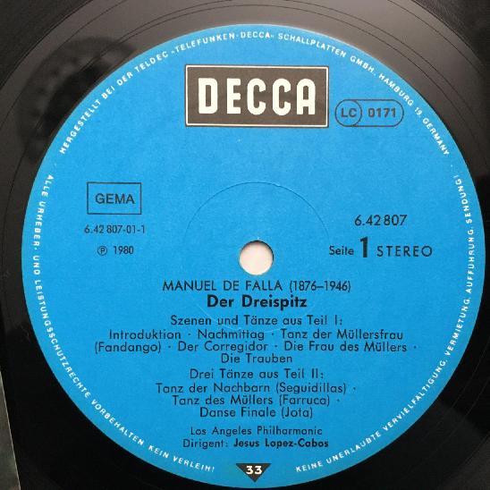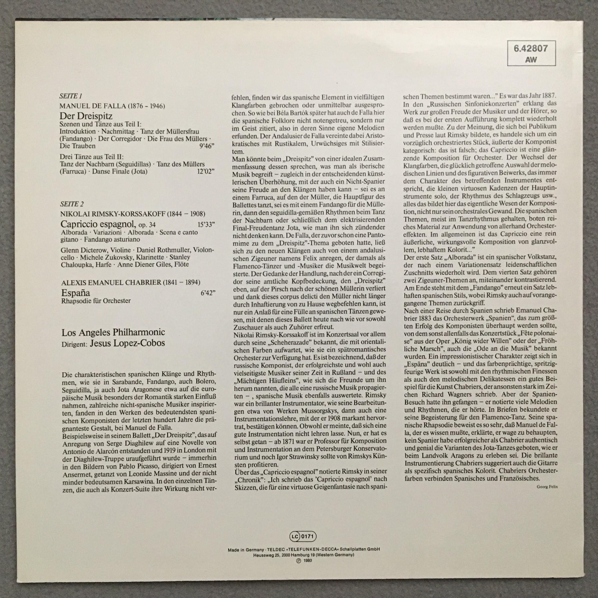 P945 Falla Der Dreispitz Rimsky- Korsakov Lobez-Cobos DECCA 6.42807 AW Stereo