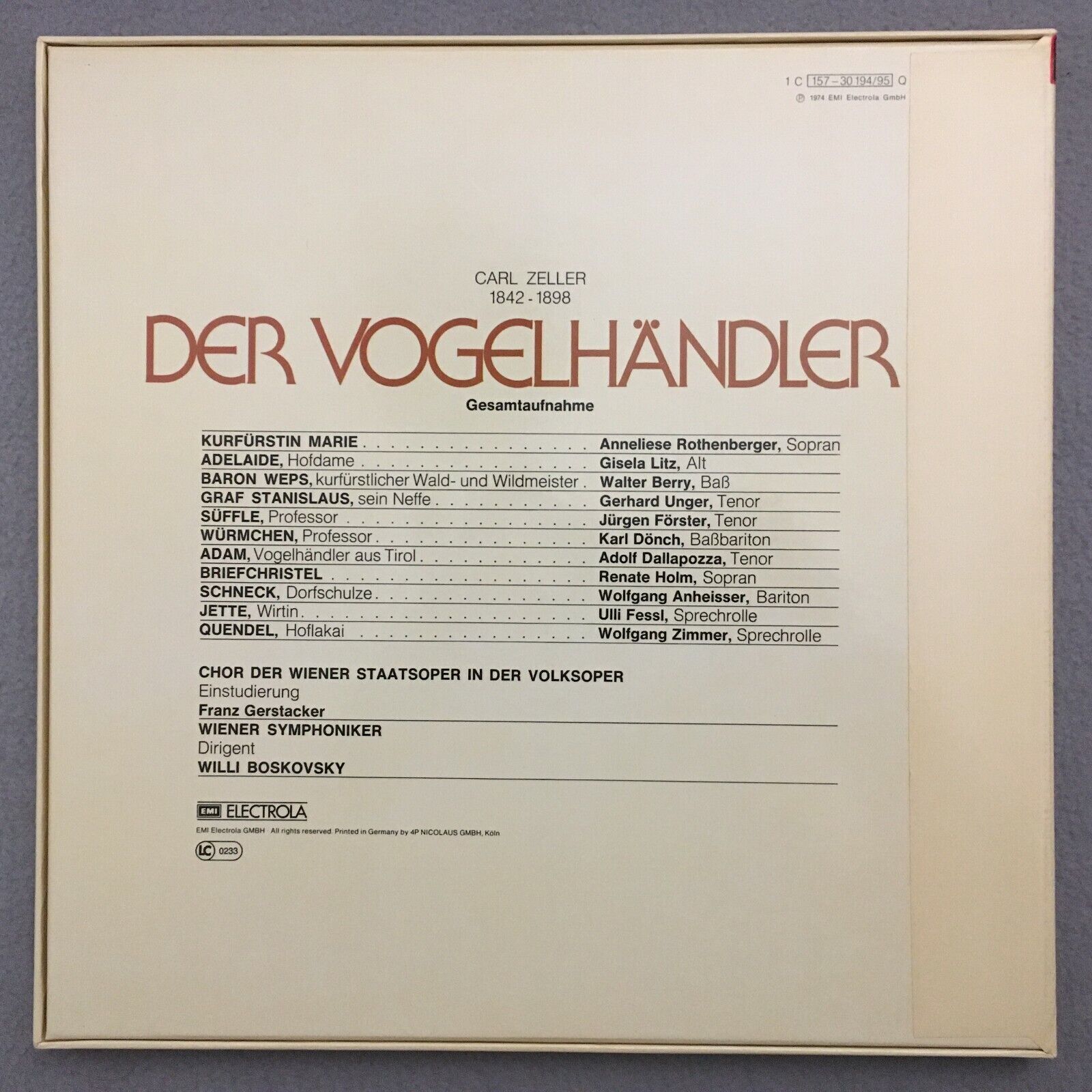 B912 Zeller Vogelhändler Rothenberger Boskovsky VSO 2LP EMI 1 C 157-30 194/95 Q