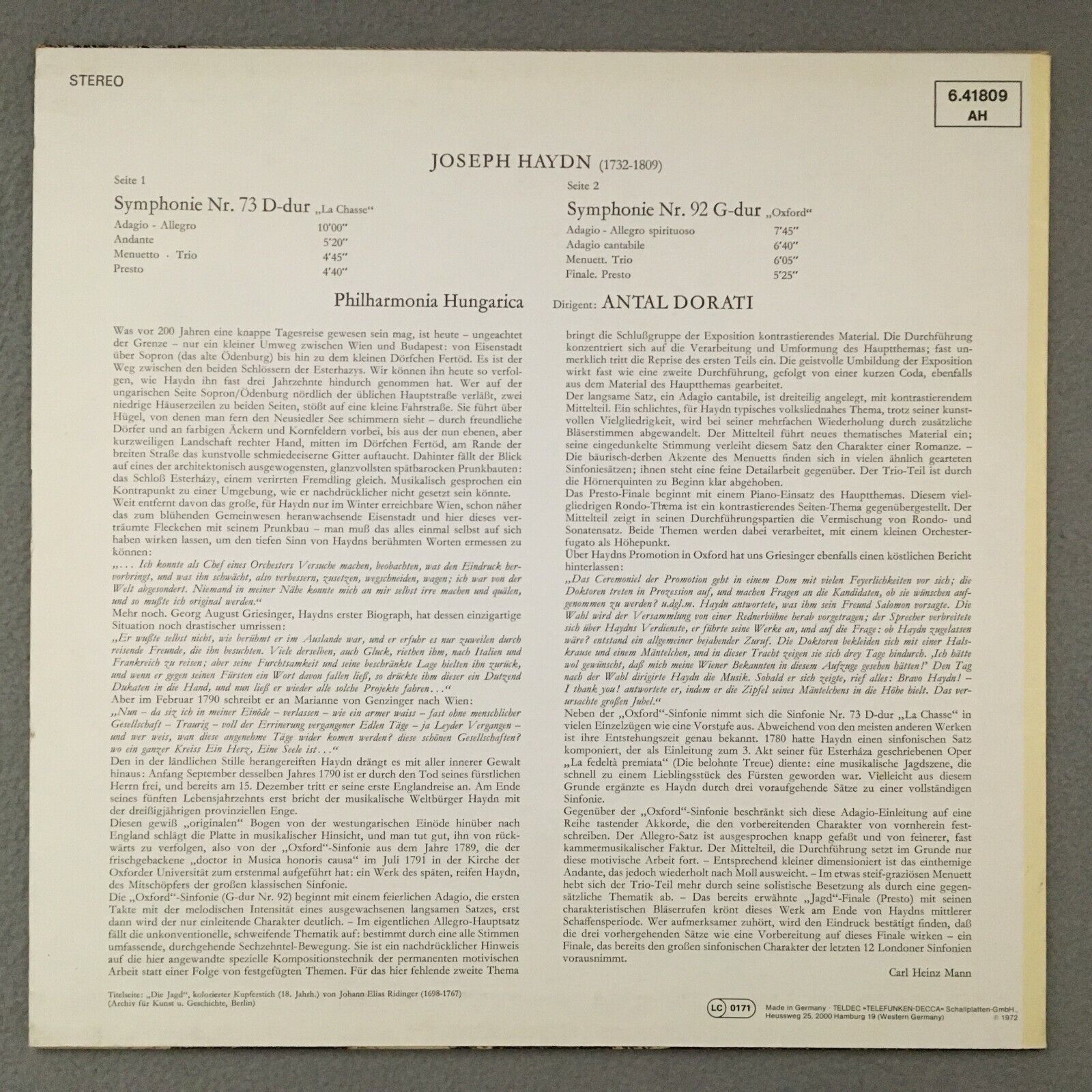 S241 Haydn Symphonies No.73 & No.92 Dorati DECCA 6.41809 AH Stereo