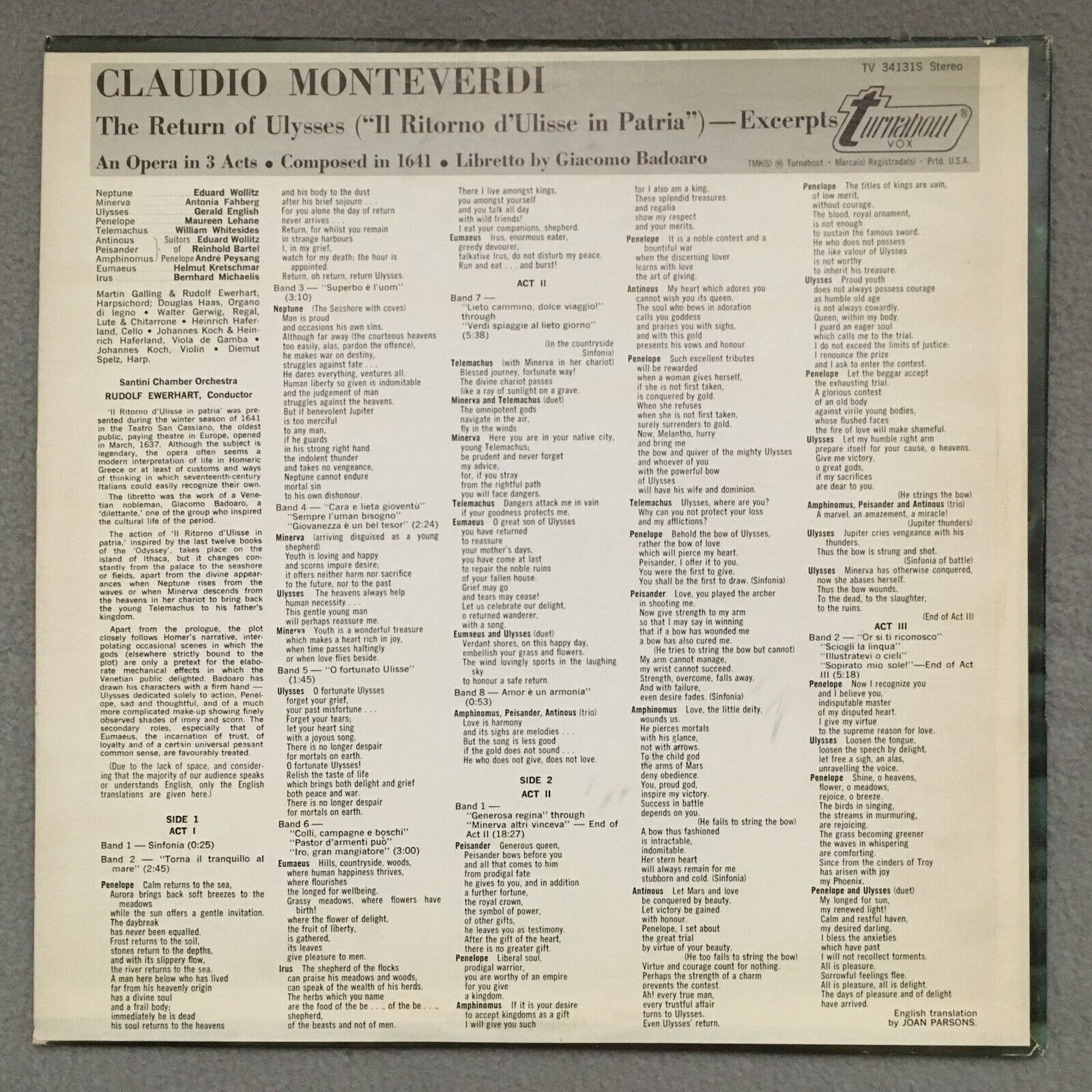 S874 Monteverdi The Return of Ulysses Ewerhart Turnabout TV 34131S Stereo