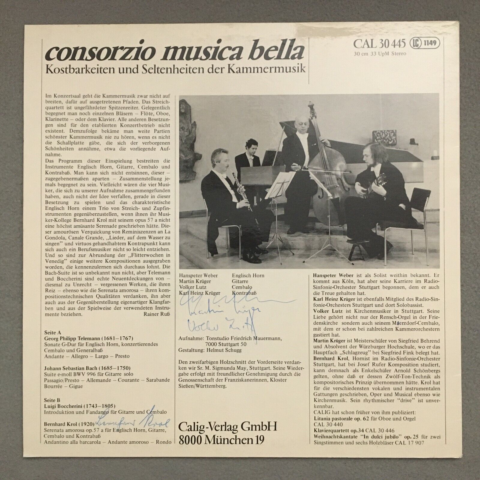 S649 Telemann Bach Boccherini Krol Chamber Music Calig CAL 30 445 Stereo Signed