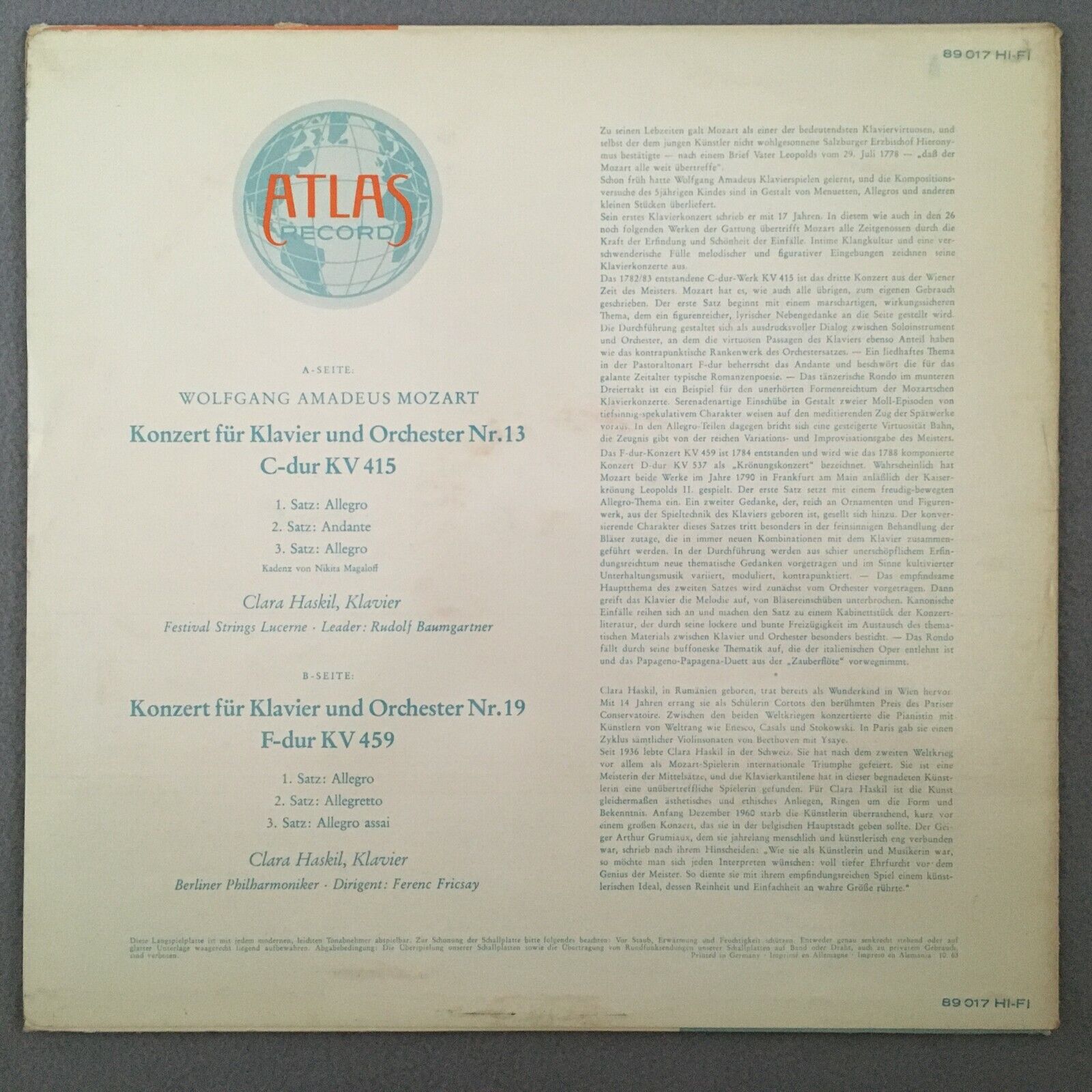 S541 Mozart Piano Concertos No.13 & 19 Haskil Baumgartner Fricsay Atlas 89 017