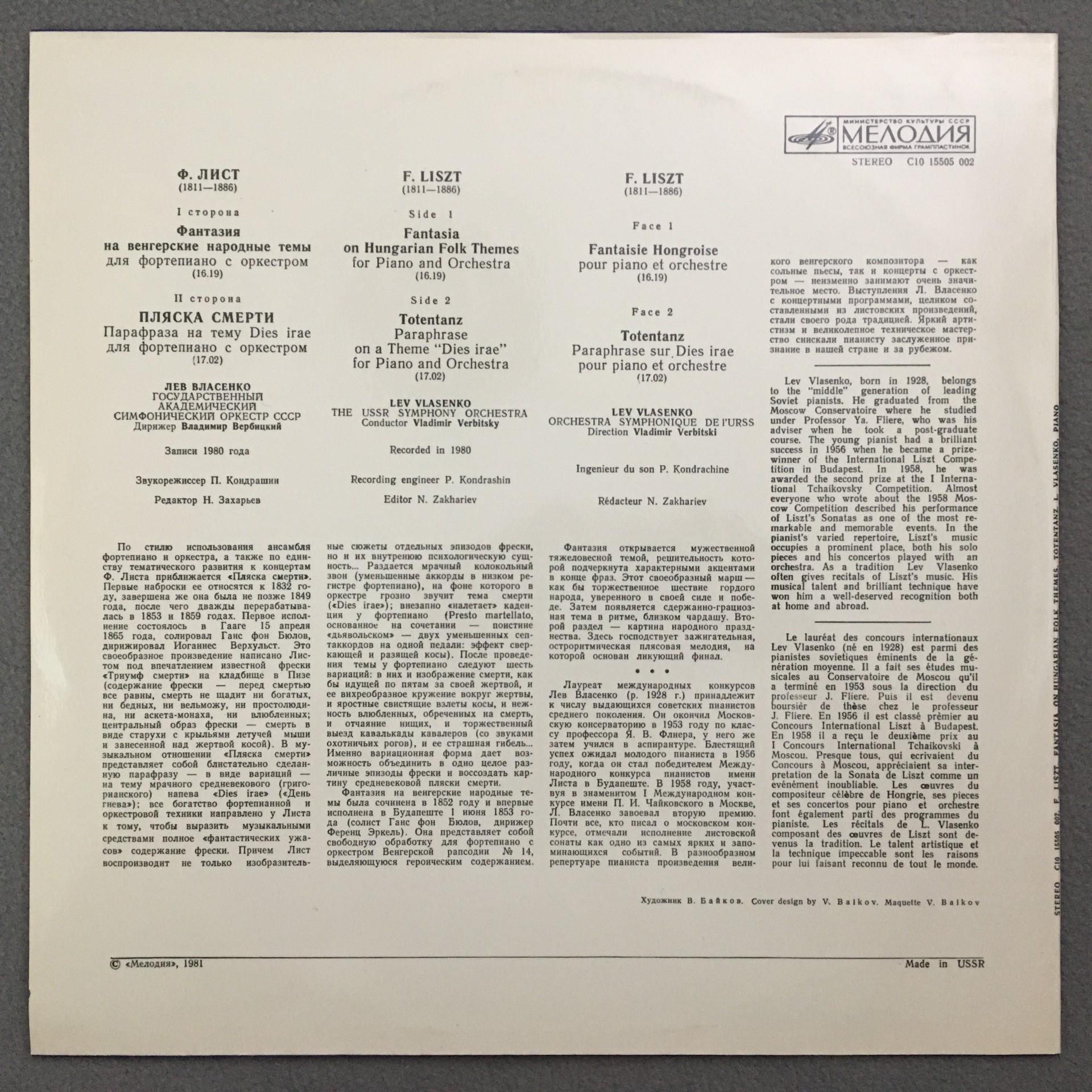 Q334 Liszt Fantasy Totentanz Vlasenko Verbitsky Melodiya C10 15505 002 Stereo