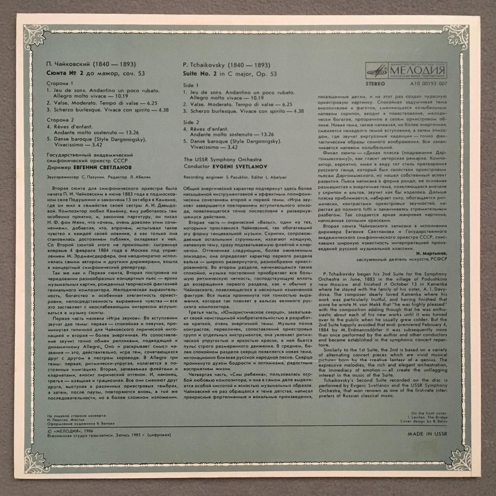 Q364 Tchaikovsky Suite No.2 Svetlanov Melodiya A10 00193 007 Stereo