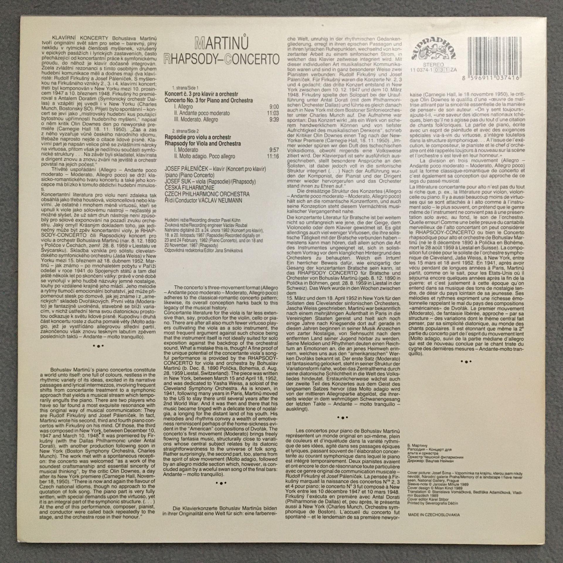 Q393 Martinu Concertos Suk Palenicek Neumann Supraphon 11 0374-1 ZA Dig St