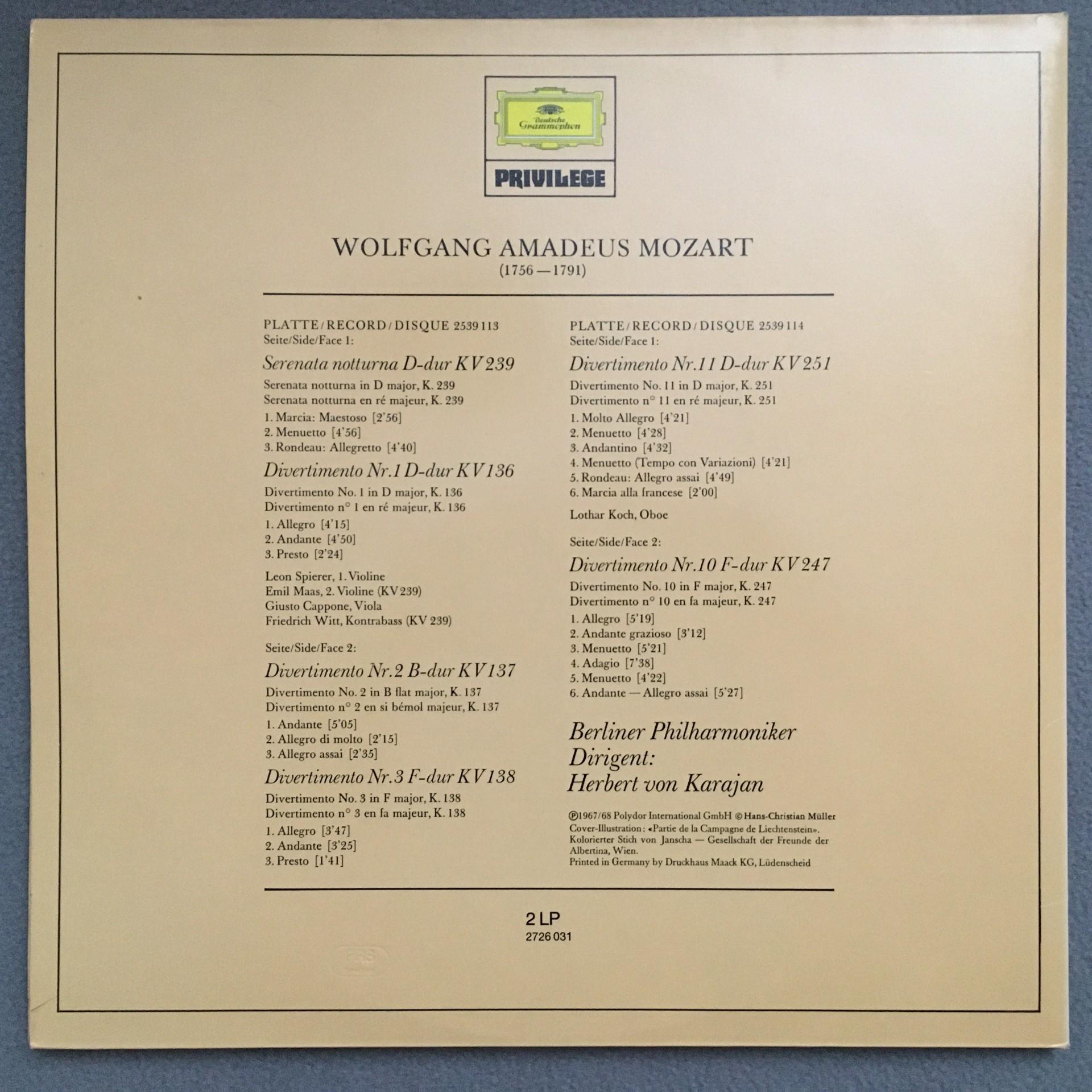 Q430 Mozart Divertimenti Serenades Vol.1 Karajan BPO 2LP DGG 2726 031 Stereo