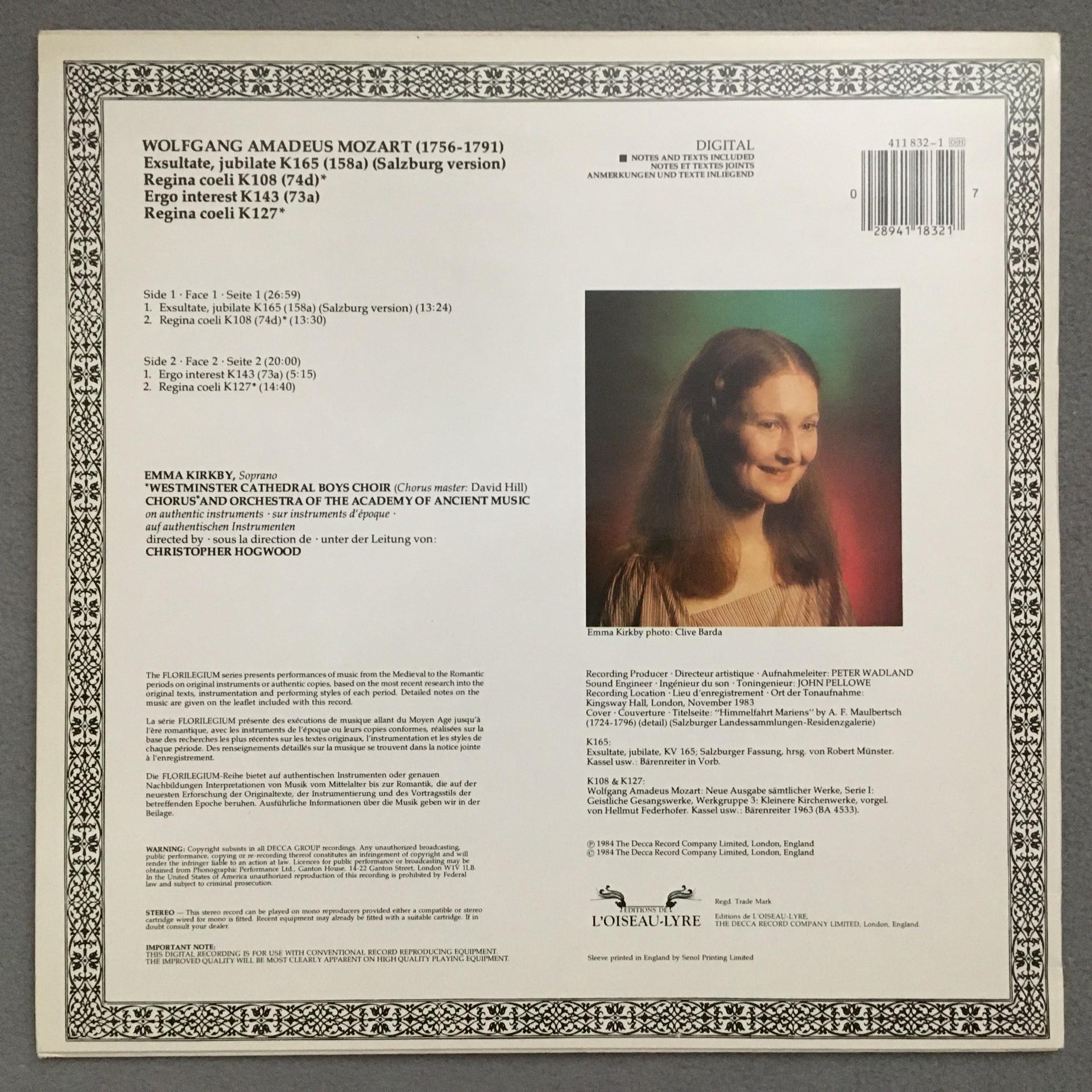 Q440 Mozart Exsultate Jubilate Kirkby Hogwood L´Oiseau-Lyre 411 832-1 Dig Stereo