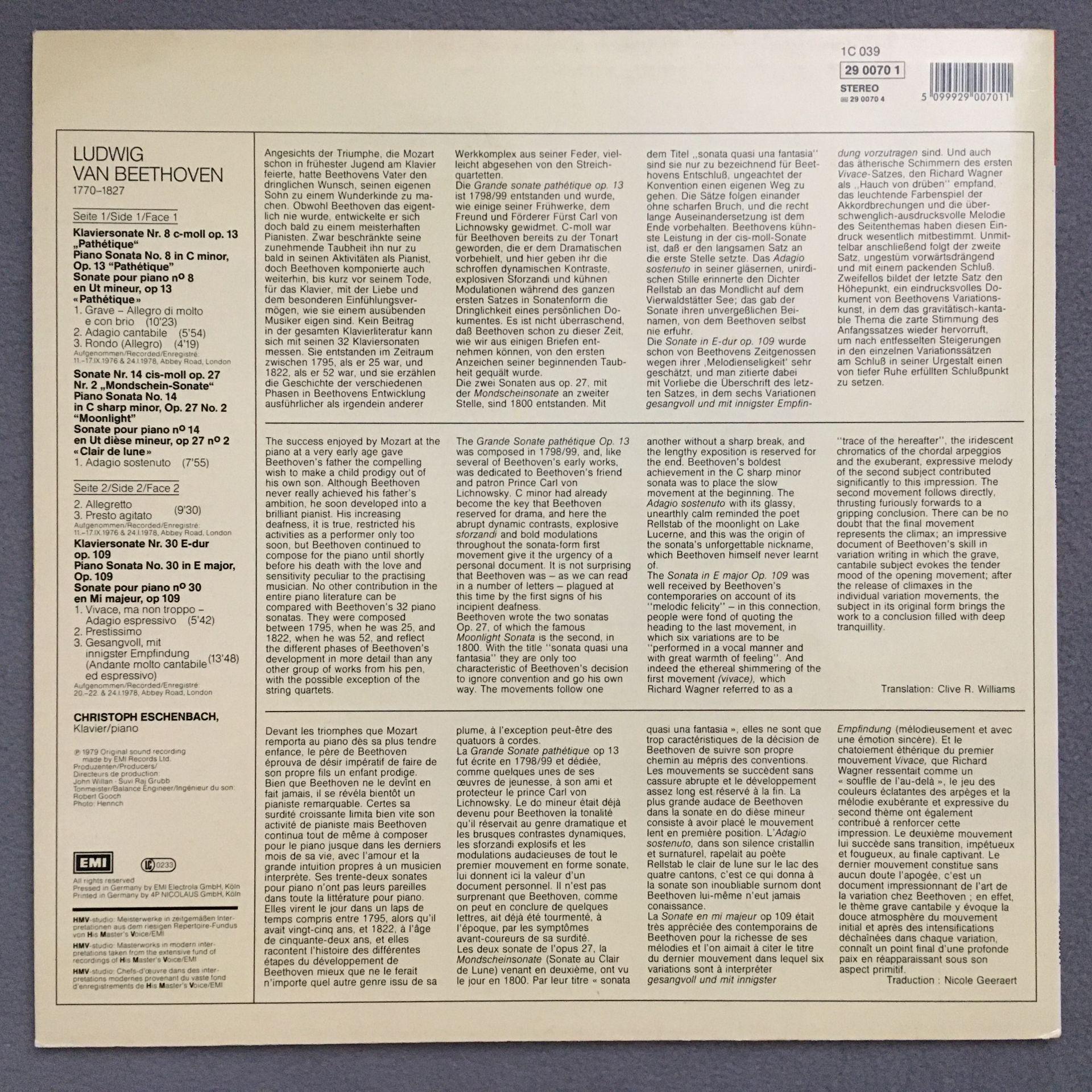 Q452 Beethoven Piano Sonatas Eschenbach EMI 29 0070 1 Stereo