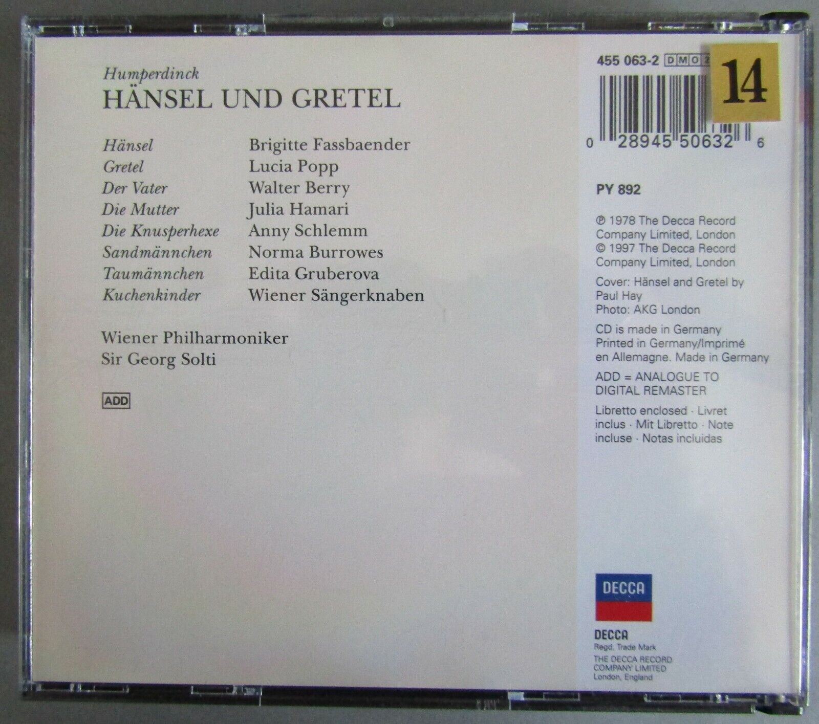 CZ015 Humperdinck Hansel und Gretel Fassbaender Popp Berry Georg Solti Decca 2CD