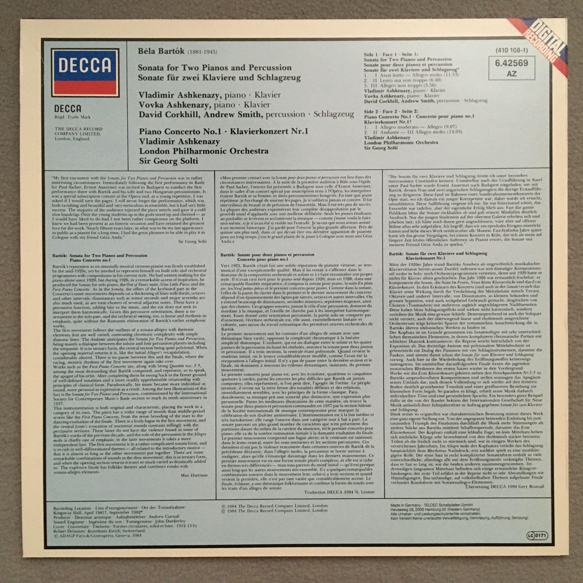 Q648 Bartok Piano Concerto Ashkenazy Solti DECCA 6.42569 AZ Digital Stereo