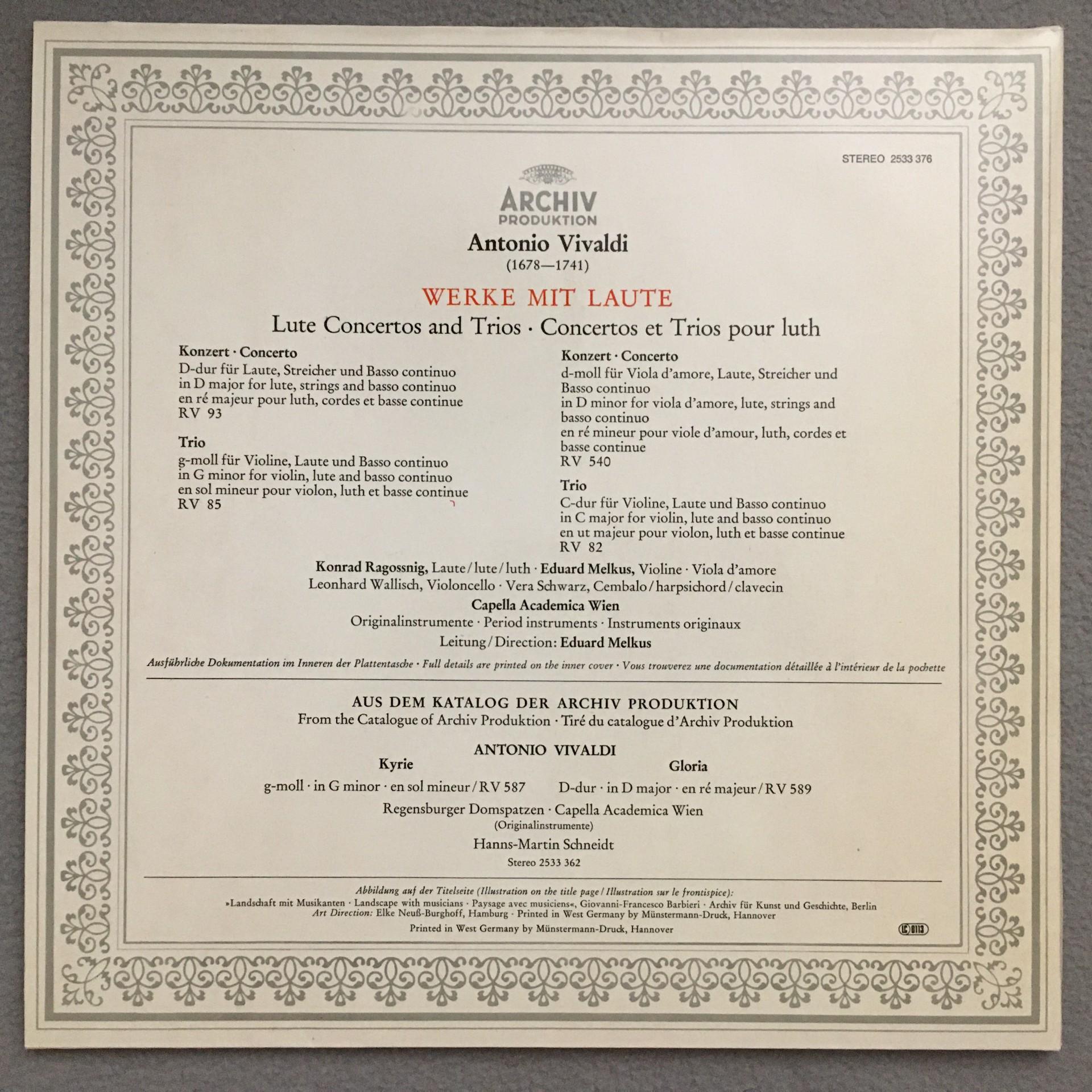 Q654 Vivaldi Lute Concertos & Trios Ragossnig Melkus DGG Archiv 2533 376 Stereo