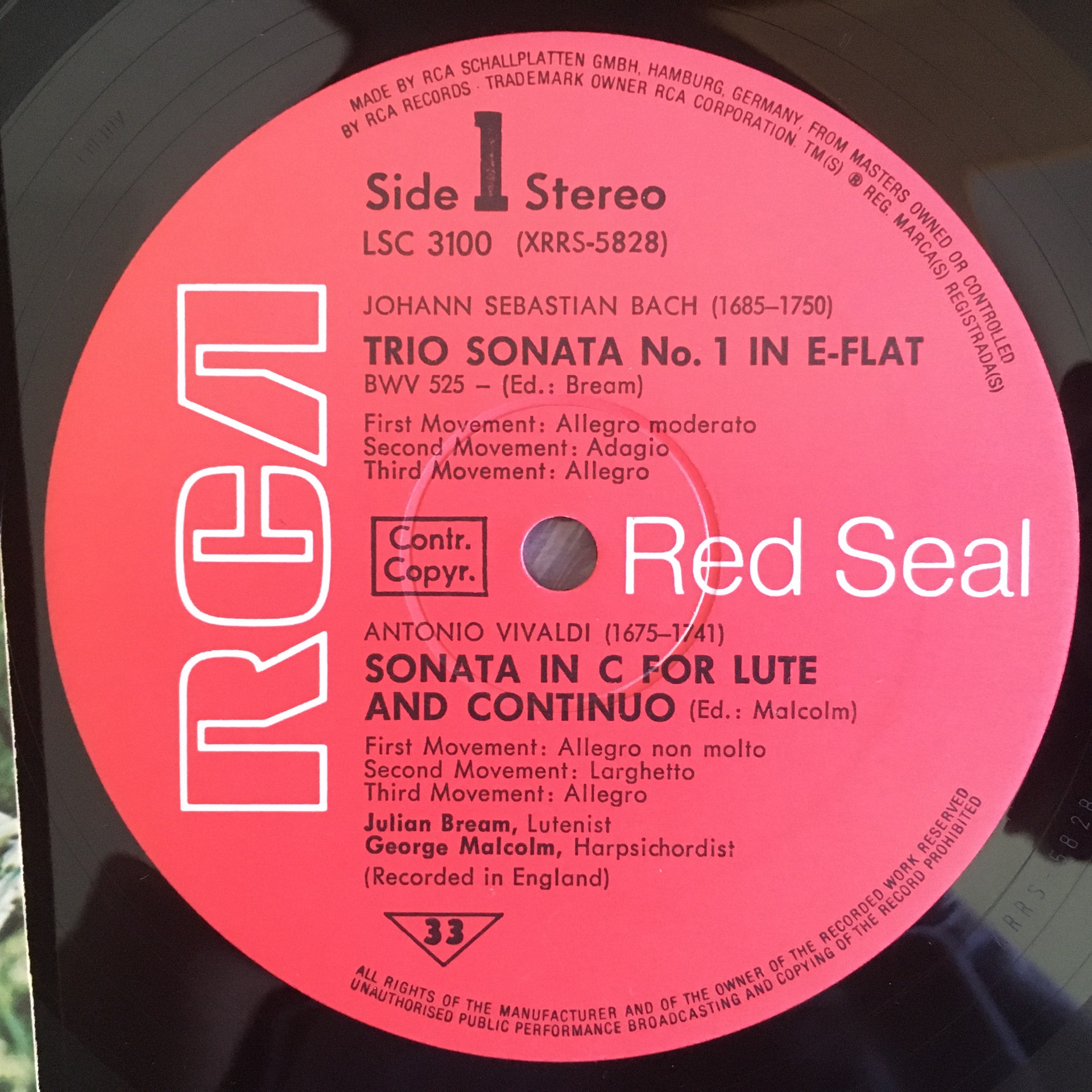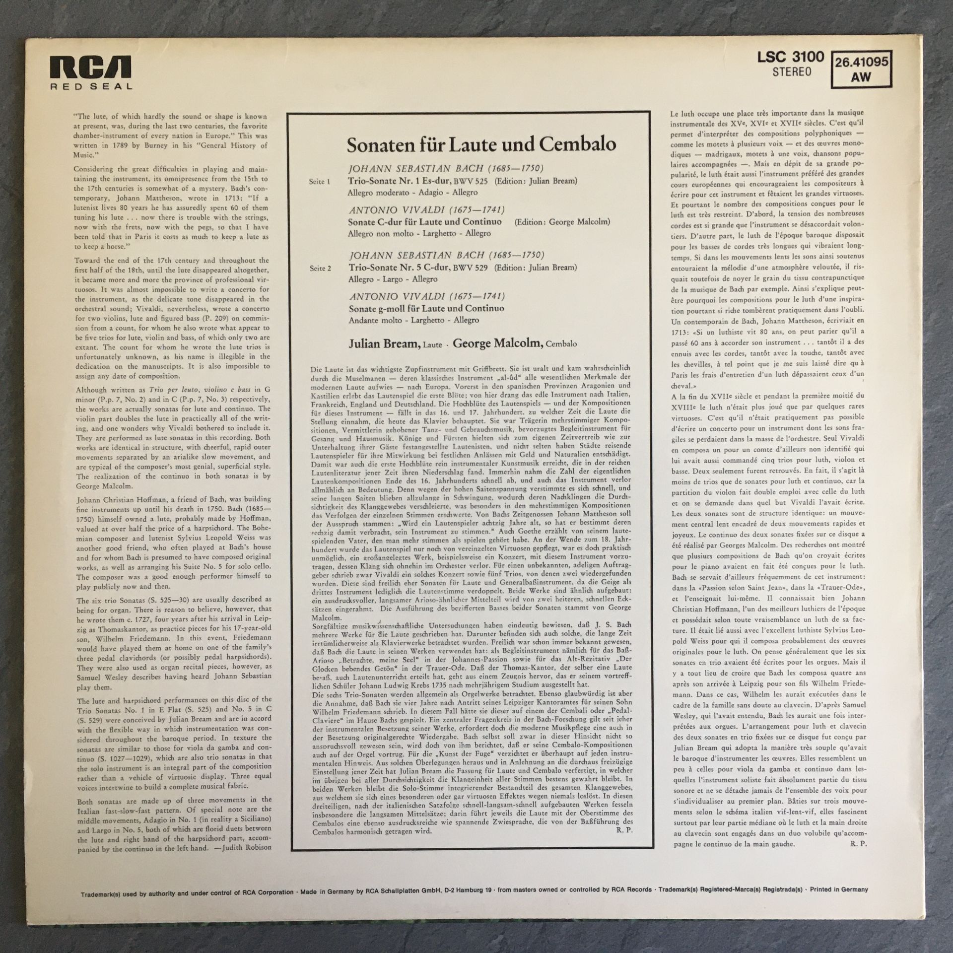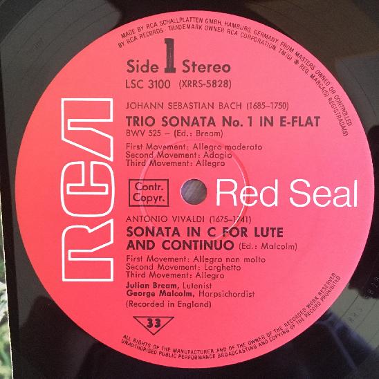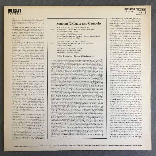 R324 Bach Vivaldi Sonatas Bream Lute Malcolm Harpsichord RCA LSC 3100 Stereo