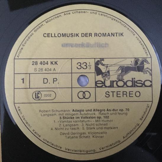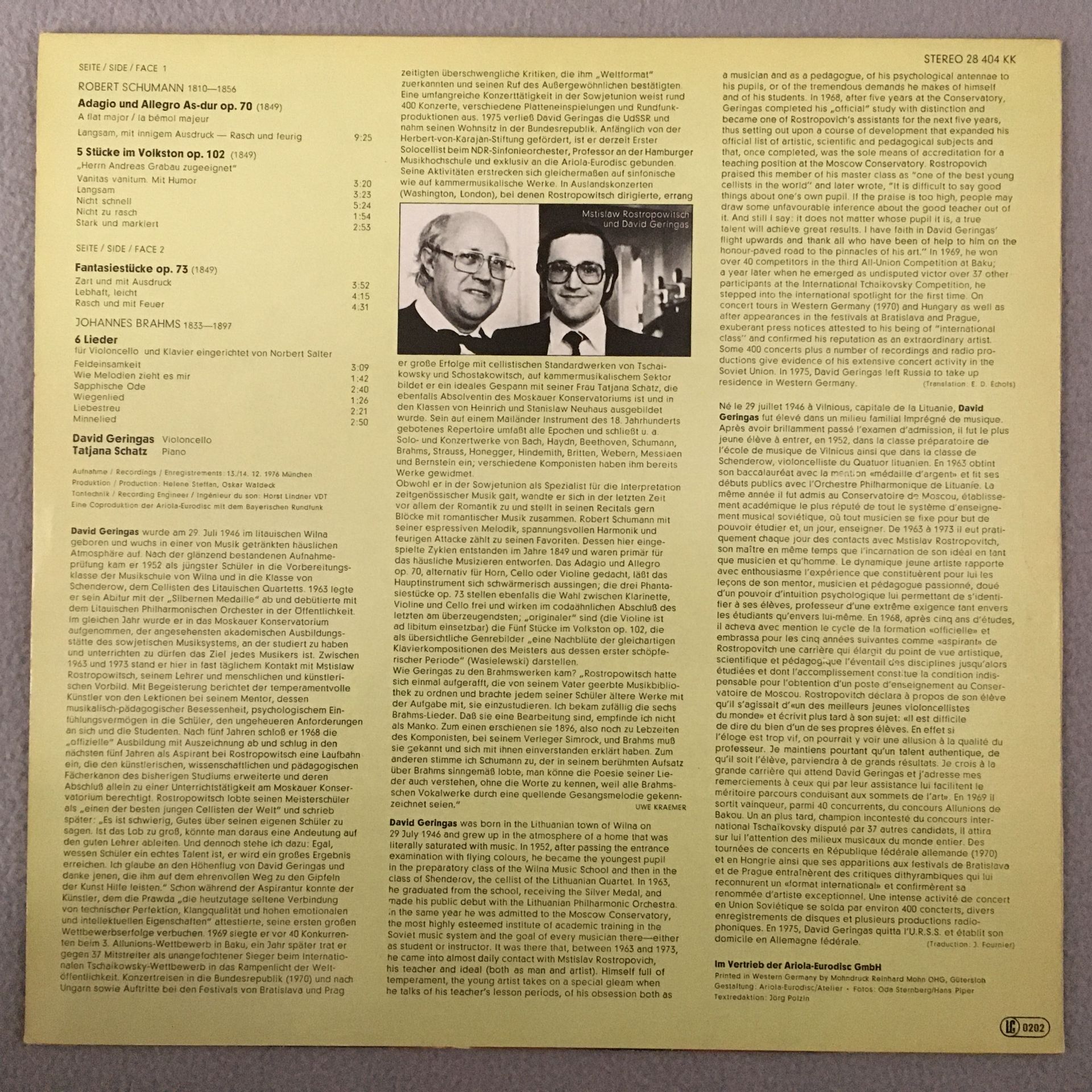 R329 Geringas Cello Music Schumann Brahms Schatz Piano Eurodisc 28 404 KK Stereo