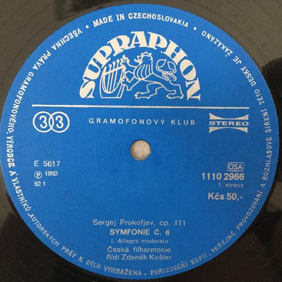 R395 Prokofiev Symphony No.6 Kosler Supraphon 1110 2966 ZA Stereo