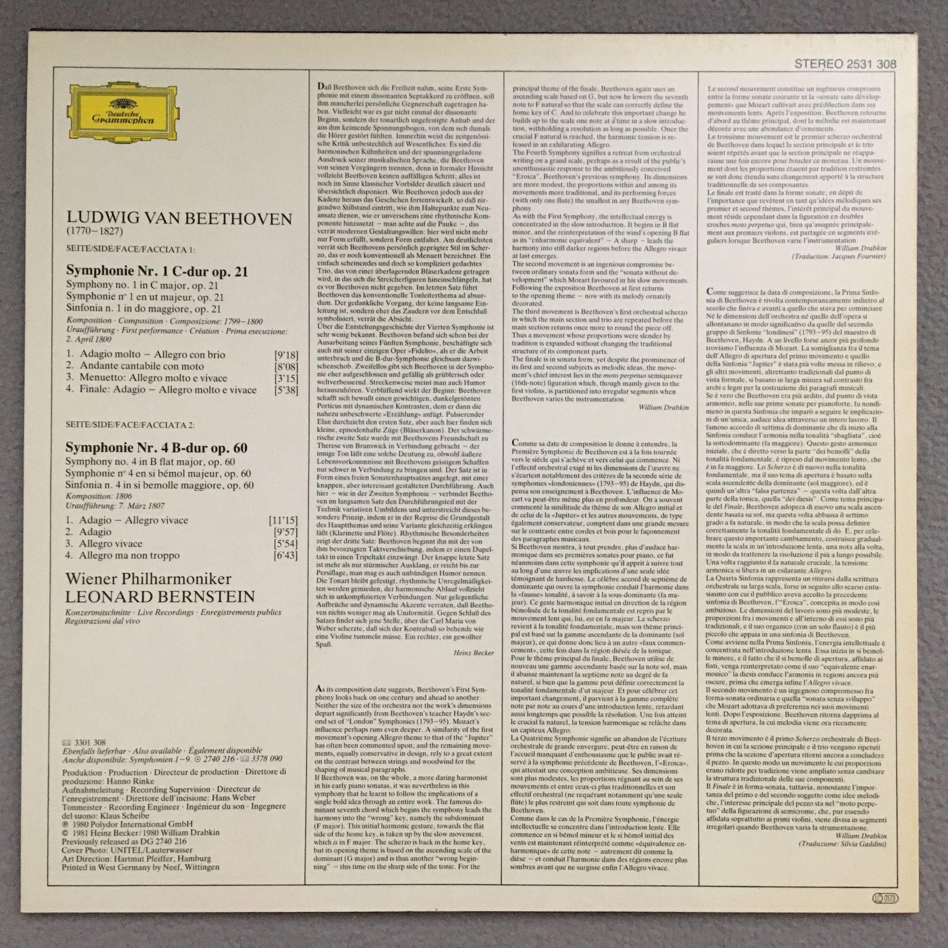 O667 Beethoven Symphonies No.1 & No.4 Bernstein VPO DGG 2538 074 Stereo