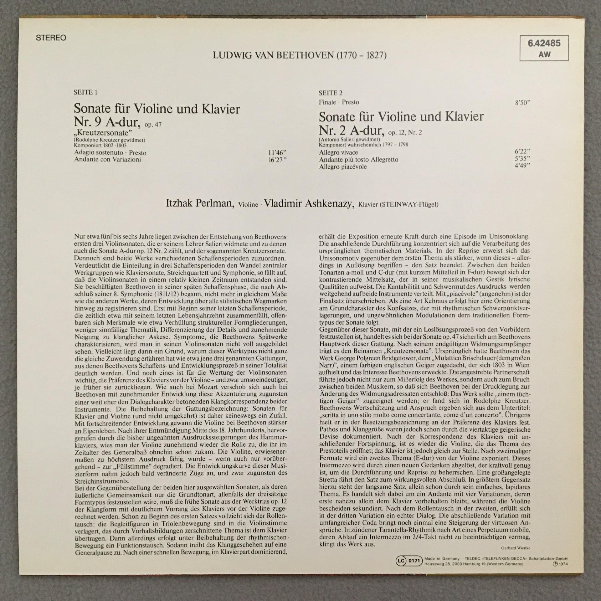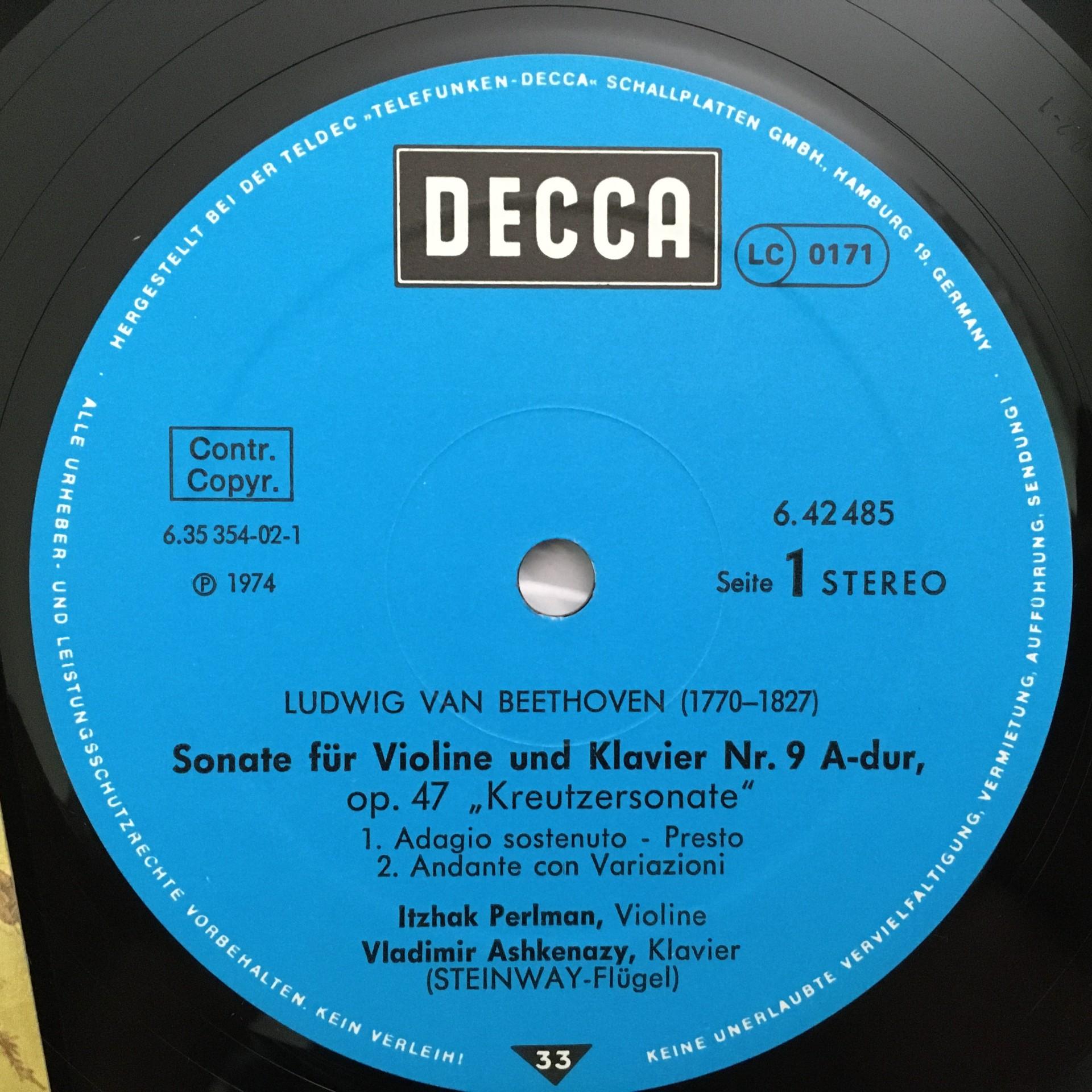 Q691 Beethoven Violin & Piano Sonatas Perlman Ashkenazy DECCA 6.42485 AW St