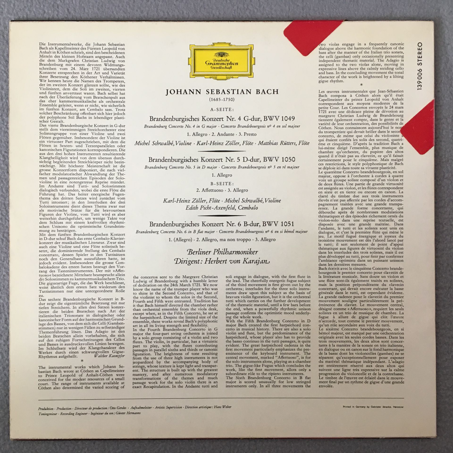 R435 Bach Brandenburg Concertos No.4 & 5 & 6 Karajan DGG 139 006 SLPM Stereo