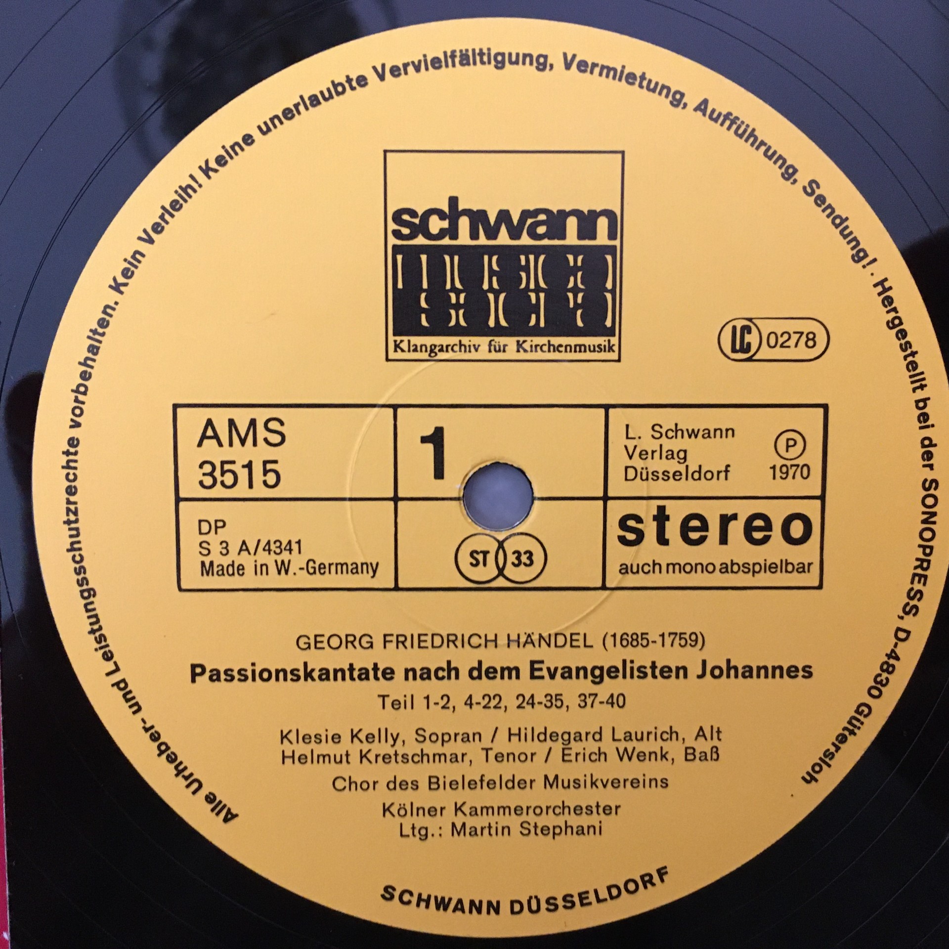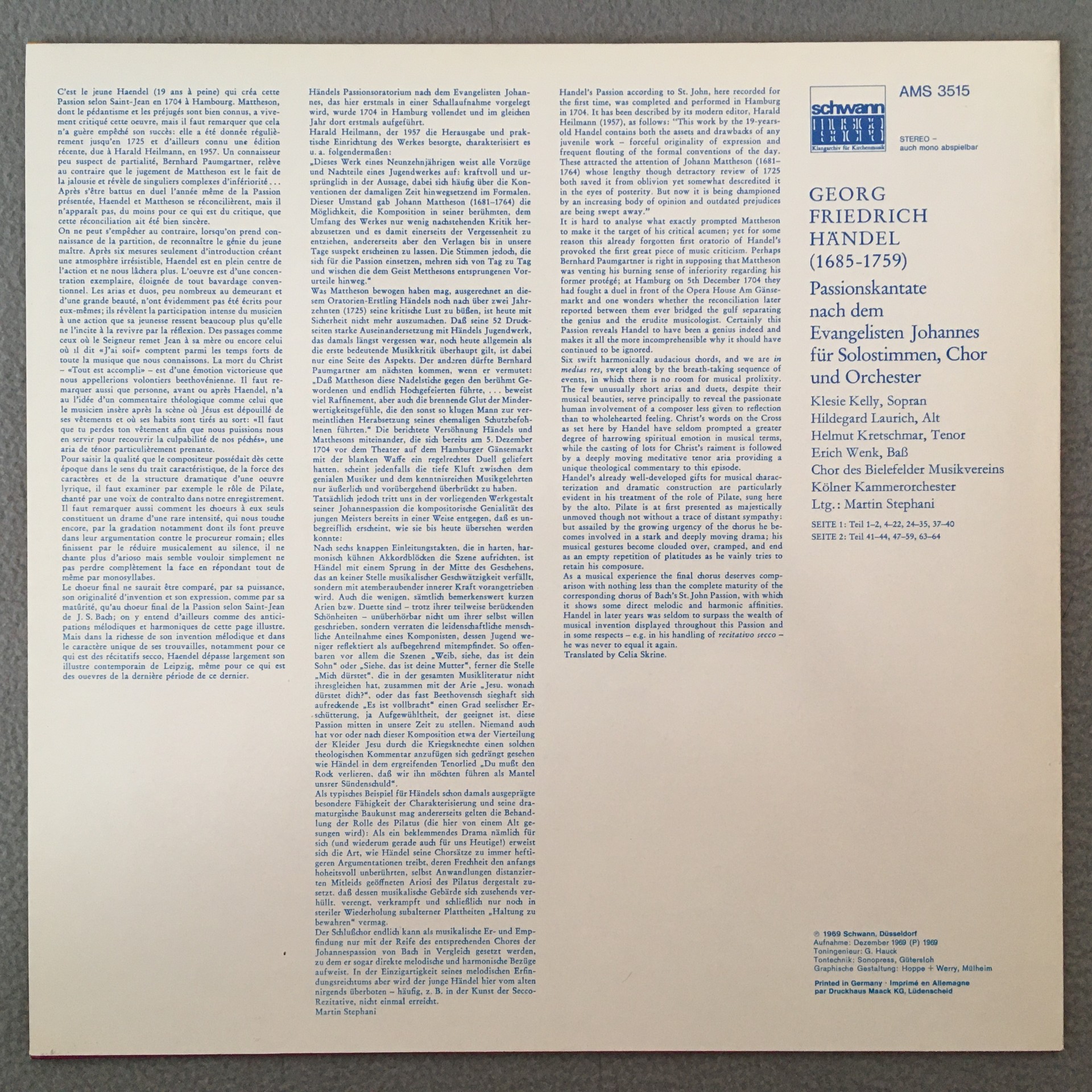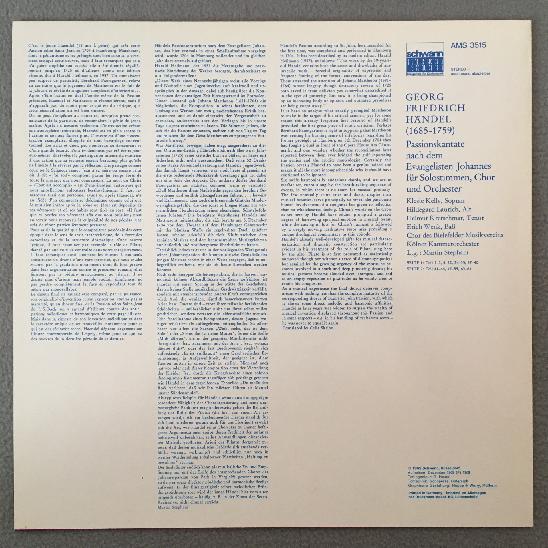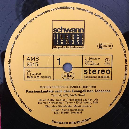 R438 Handel Cantata Passion Kelly Stephani Schwann AMS 3515 Stereo